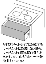 うす型フラットタイプに対応するキャビネットに設置しない場合、キャビネット前面の開口部があく為、前パネルセットを取り付けて下さい