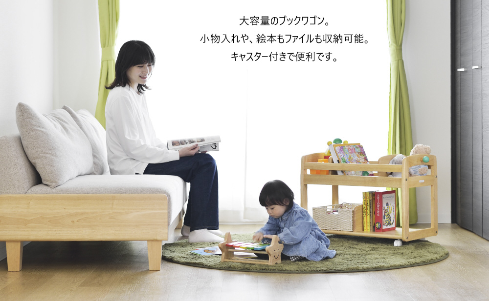 ●フレキシブルに使える収納ワゴンです。●絵本やおもちゃ、教材などしっかり収納できます。●仕切り板は3枚付きで、位置が変えられます。仕切り板の位置変更は工具不要で簡単。●キャスター付きで、好きな場所への移動も楽々。それぞれの家族にぴったりの使い方ができます。