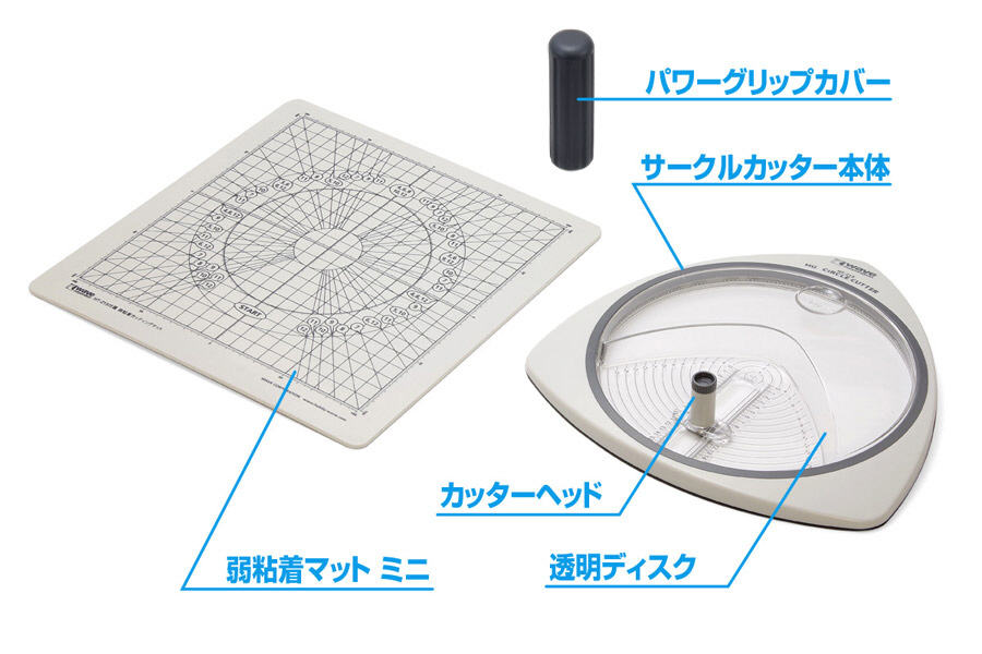 ■カッターヘッドがセットされた透明ディスクを回転させて、円を切り抜くサークルカッター。