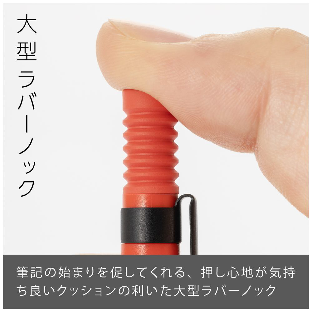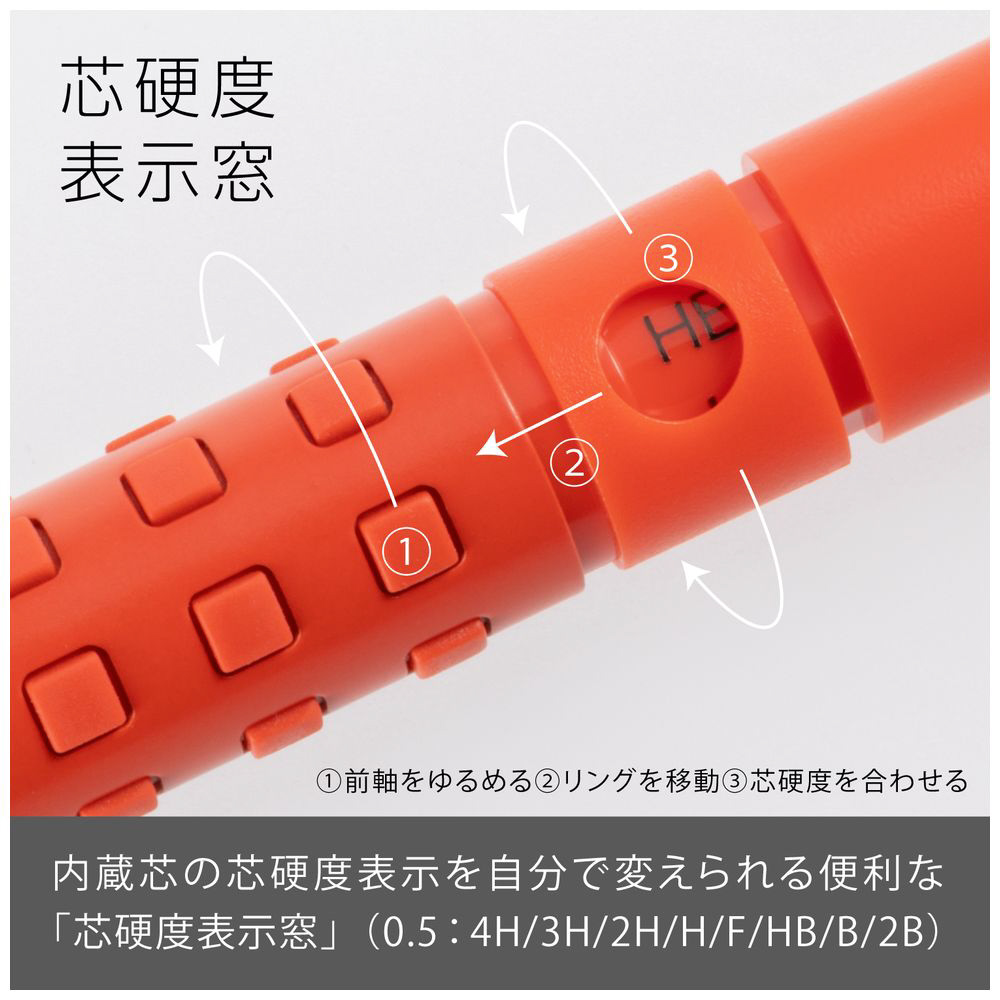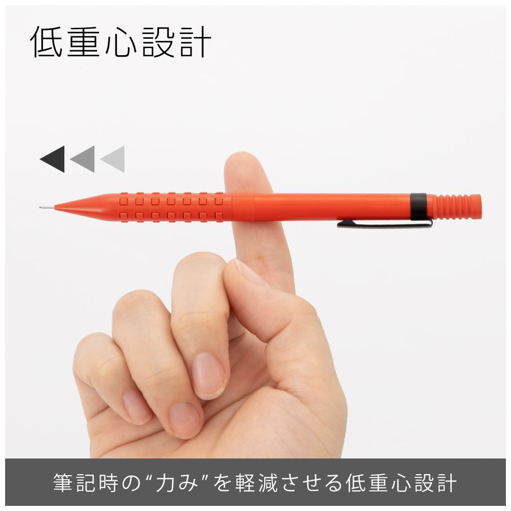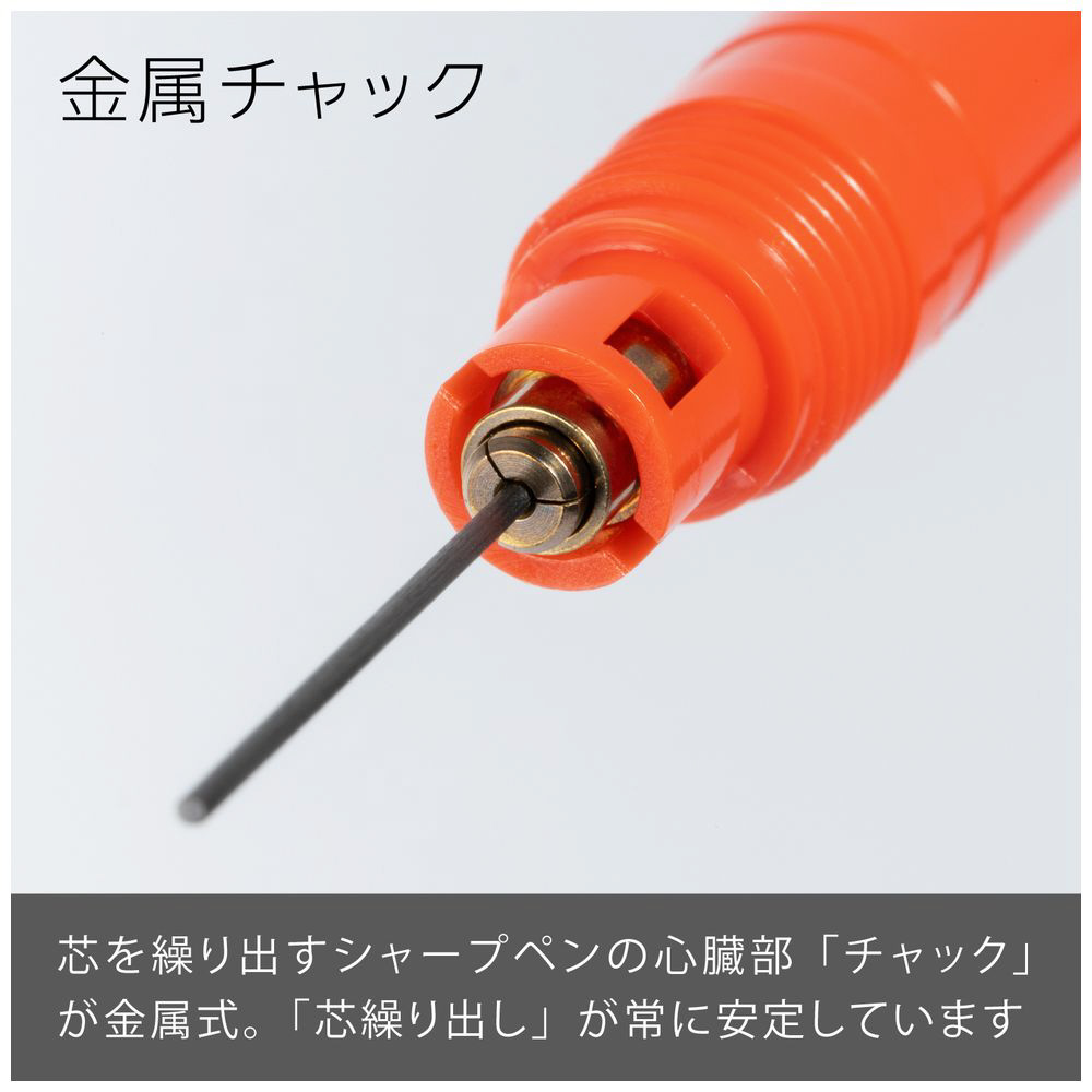 先金・前軸一体構造でブレない安定した書き心地。手になじみ、しっかり握れる金属×ラバーグリップ。芯硬度表示窓付き。 大型ラバーノック。