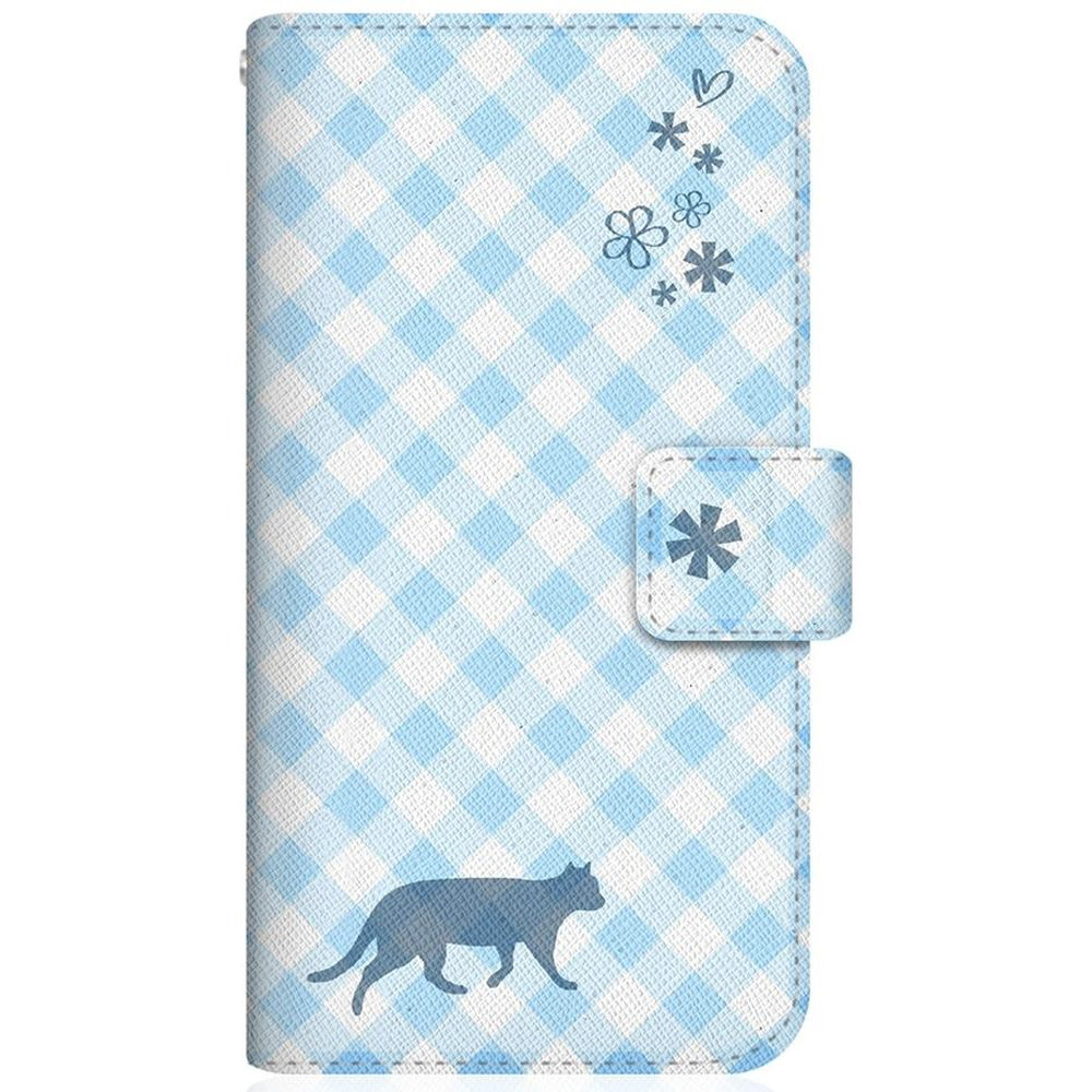 NYAGO G5NZ6 スリム手帳型ケース NYAGO ノート サマー フラワー ダイアリー キャット シルエット - ブルー チェッククロス柄 & てくてくお散歩