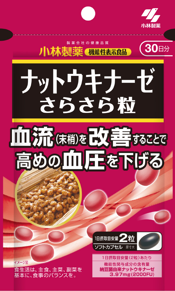 ●血流(末梢)を改善することで、高めの血圧を下げる機能性表示食品●届出表示: 本品には納豆菌由来ナットウキナーゼが含まれます。納豆菌由来ナットウキナーゼは、血流(末梢)を改善することで血圧が高めの方の血圧を下げる機能が報告されています。血圧が高めの方に適した食品です。●機能性関与成分: 納豆菌由来ナットウキナーゼ 3.97mg(2000FU)●1日摂取目安量: 2粒●30日分(60粒)