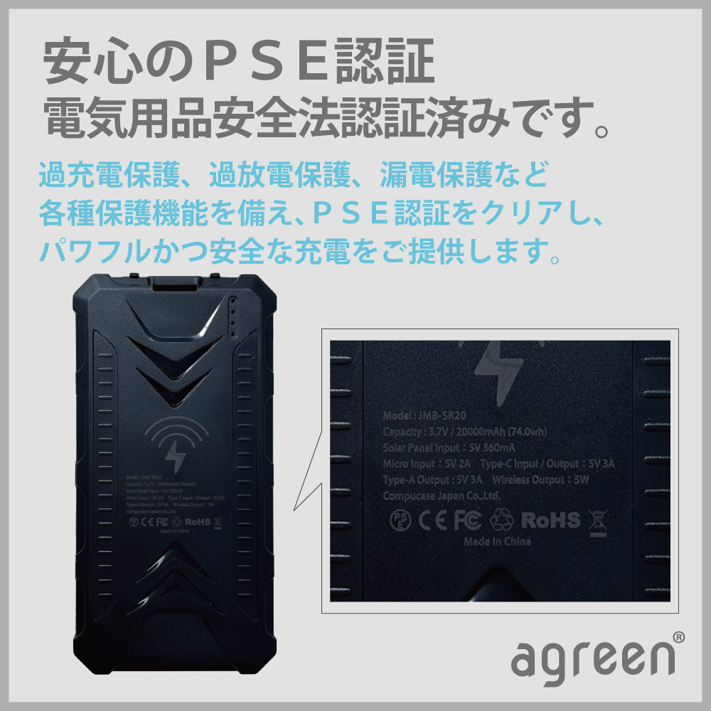 ●ソーラーパネル付きなので、防災/キャンプで活躍します! バッテリー大容量20000mAh表面に搭載されたソーラーパネルへ太陽光を当てることで本体に蓄電することが出来ます。 ●防水、耐衝撃、防塵仕様 IP54 ●電源が無くても本体に充電が出来ます。ソーラーパネル付きなので、太陽光を当てることで本体に蓄電出来ます。●高輝度ライト付き 夜道や停電時で懐中電灯代わりに暗闇を照らしてくれるほか、地震や台風など緊急時の救難信号として役立ちます。●USBケーブルが無くても充電出来ます。ワイヤレスチャージャー機能付きなので、USBケーブルが無くても充電可能です。