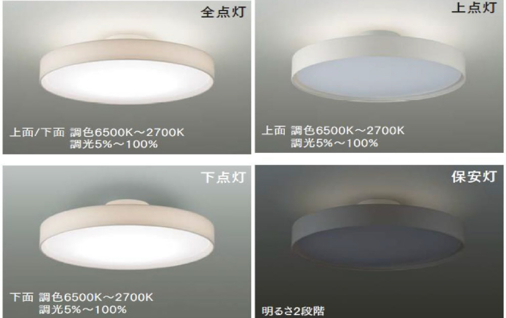 リモコン操作で明るさ、光の色を調節可能。さらに「上下点灯」、「下点灯」、「上点灯」、「全灯」を切替えできます。