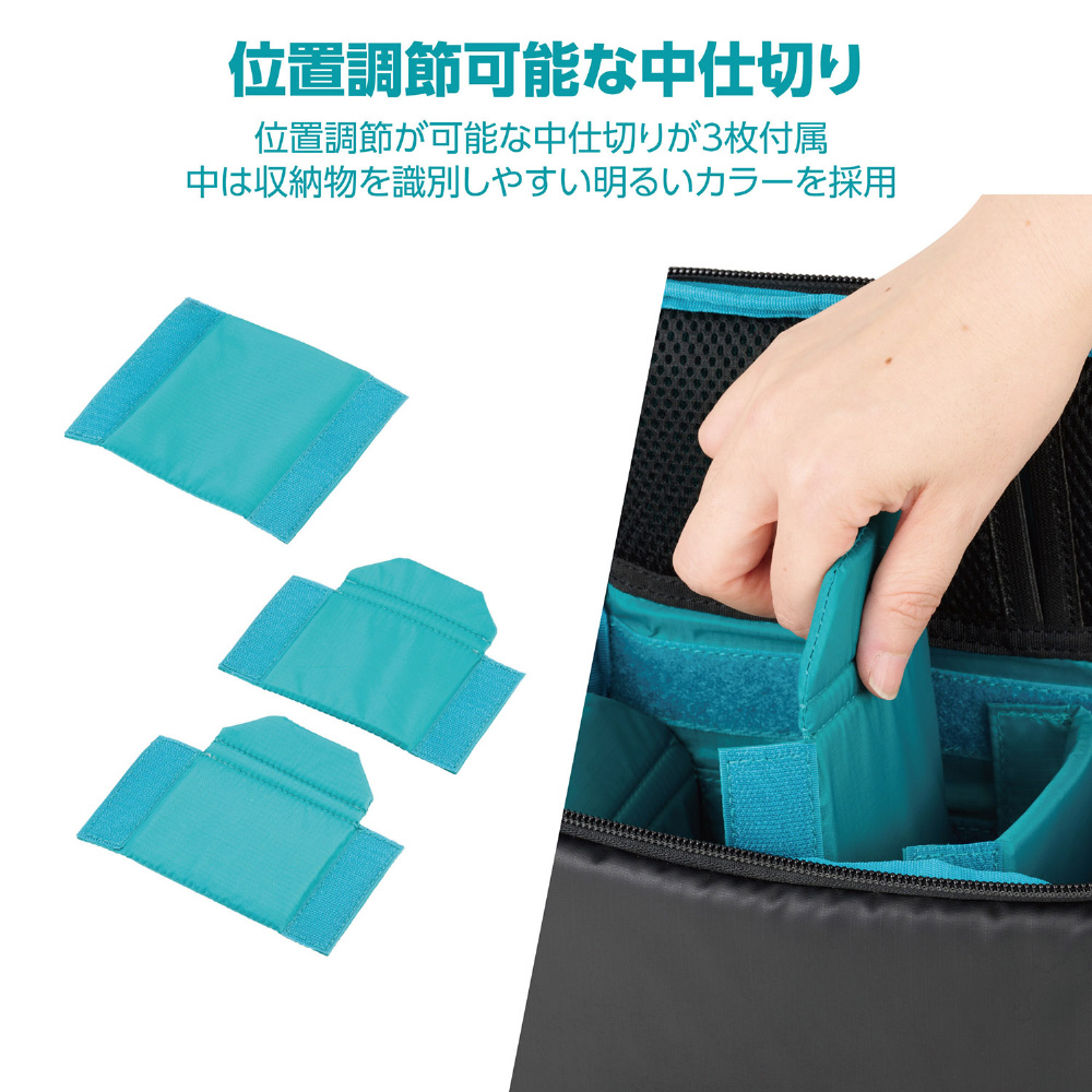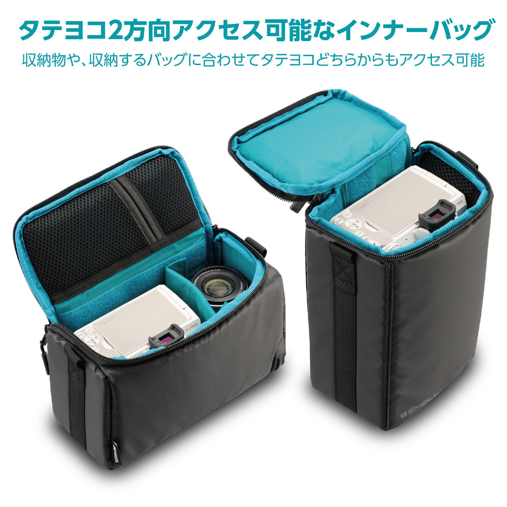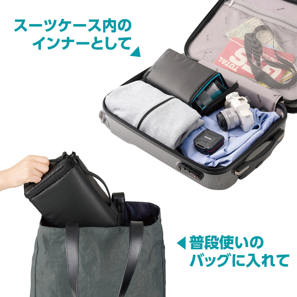 収納物や、収納するバッグに合わせてタテヨコどちらからもアクセスできるインナーバッグです。普段使いのバッグやスーツケースに入れてカメラを持ち運ぶことができます。