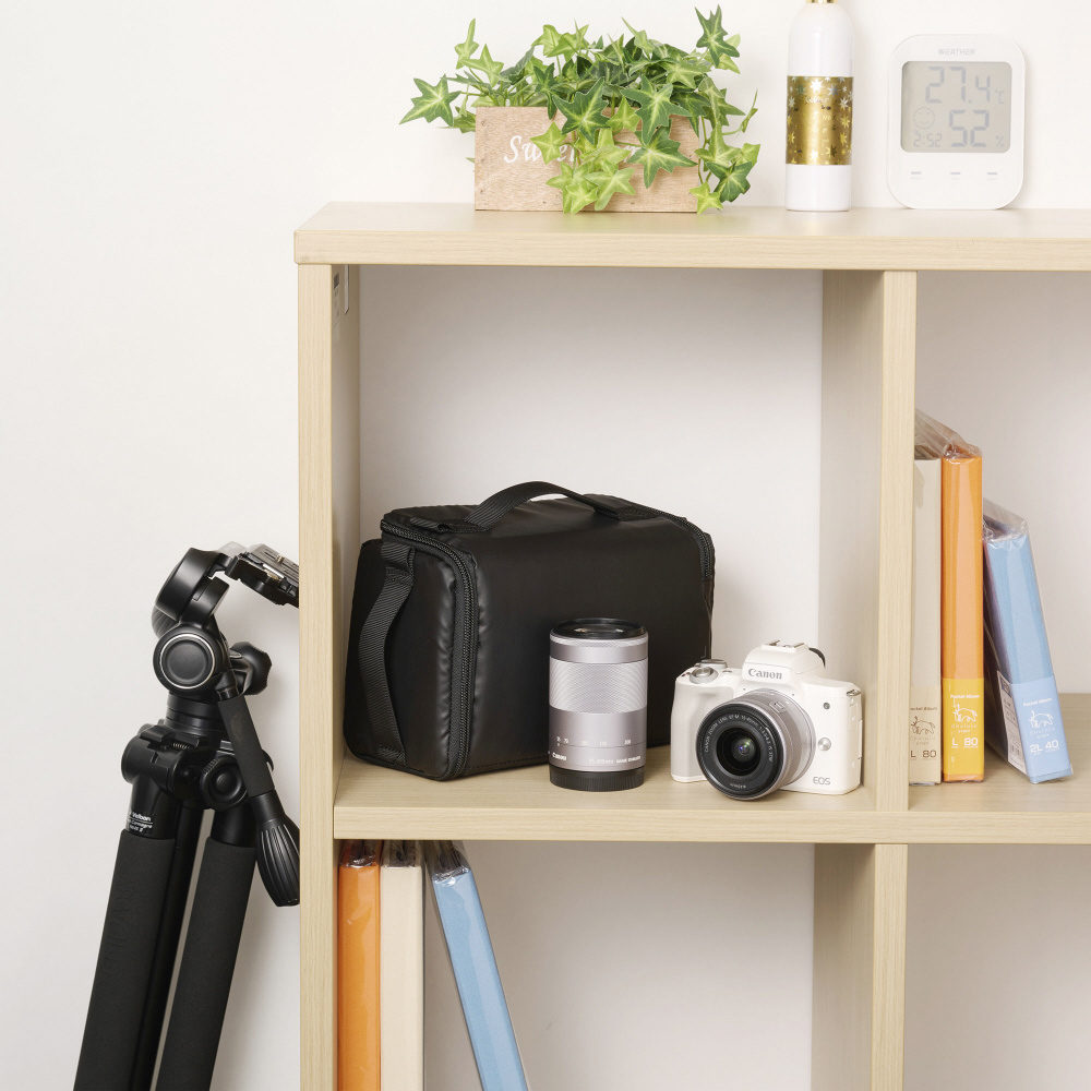標準レンズ付き小型ミラーレス一眼カメラと交換レンズ1本、周辺アクセサリーなどの収納が可能です。