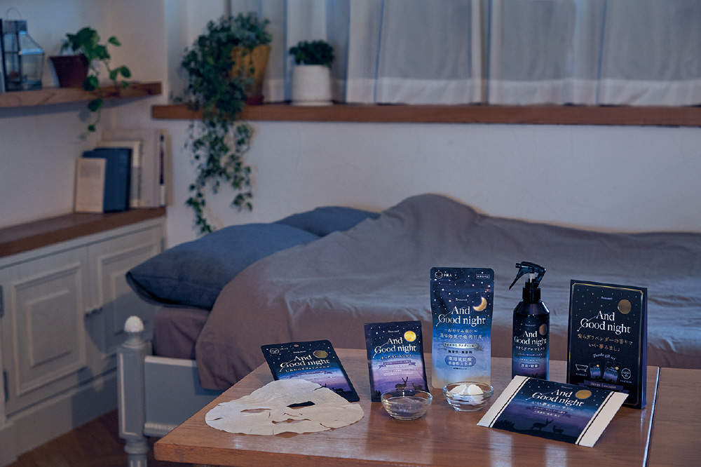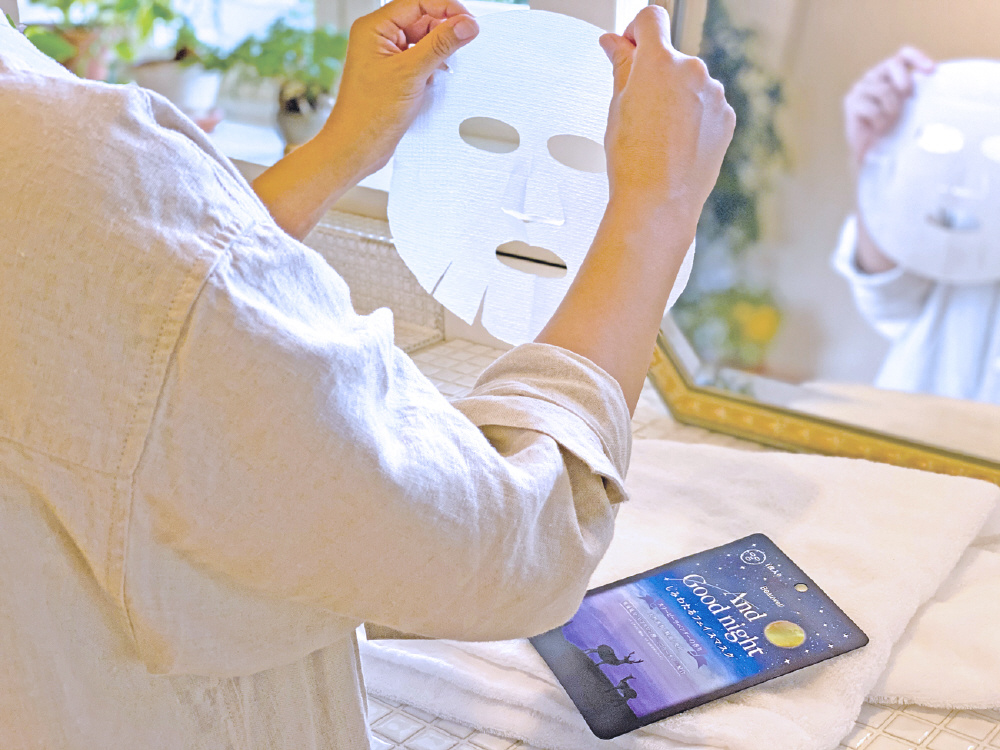 スリーピーラベンダーの香り。 安らぐ天然アロマがほのかに香る、美容液たっぷりのうるおいフェイスマスク。寝ている間の乾燥対策にも。