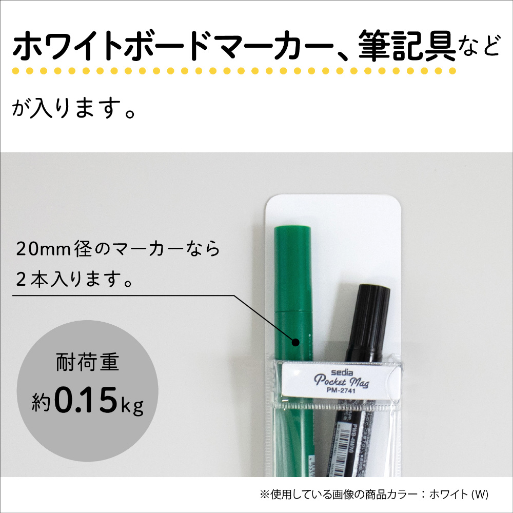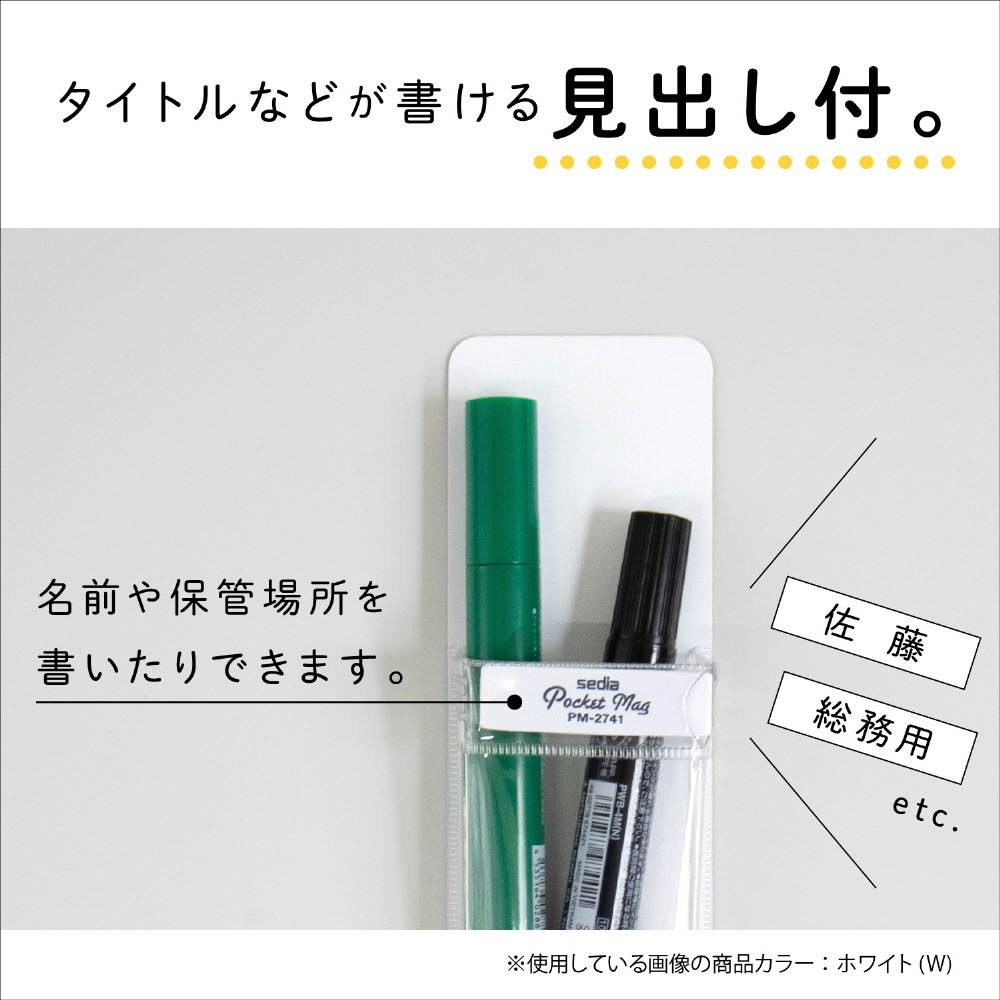 ホワイトボード、スチール家具、冷蔵庫などの金属面に貼れるマグネットタイプのポケット。ホワイトボードマーカー、筆記具などの収納に便利なSSサイズ。透明ポケットなので中身が見えて便利。裏面全面がマグネットなのでしっかり貼り付きます。ポケット上部に、タイトル等が書ける見出し付き。