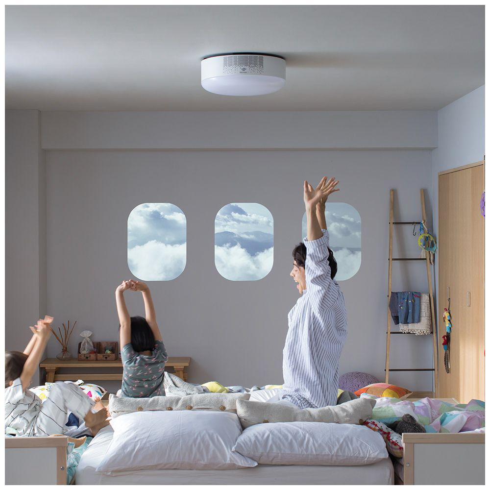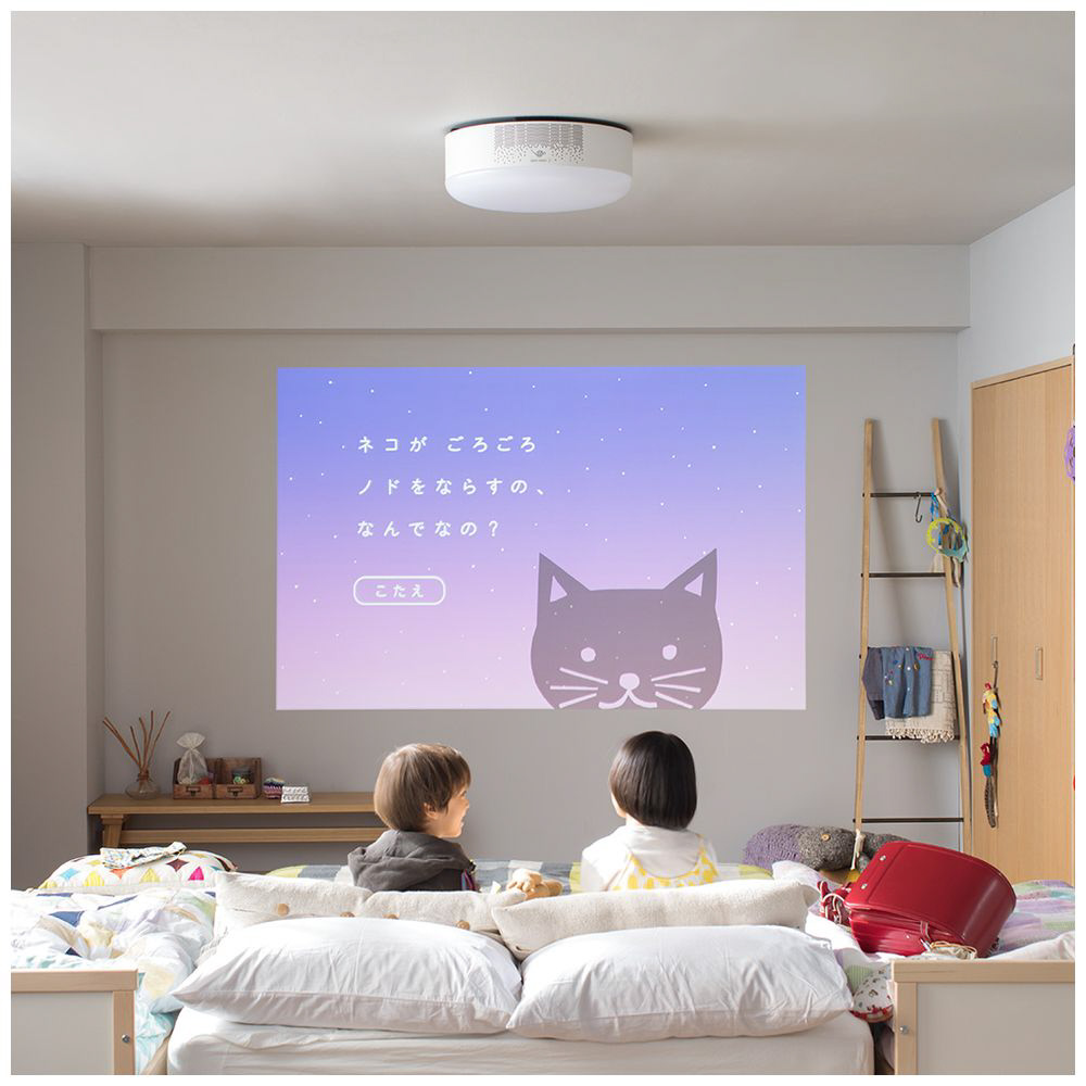 シーリングライトに「高性能プロジェクター」と「高音質スピーカー」を搭載し、 コードレスで置き場所を取らない画期的な照明一体型3in1プロジェクター
