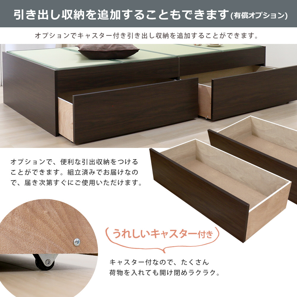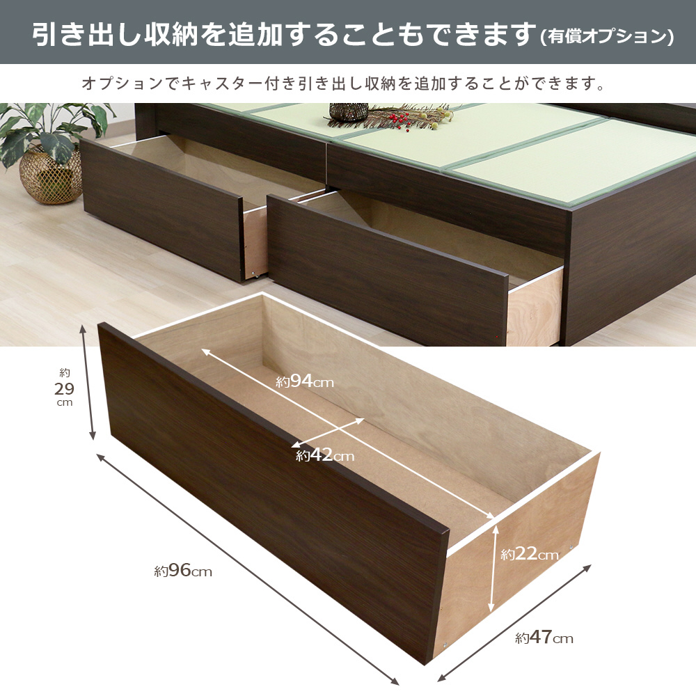 清潔感を長持ちさせる樹脂畳を使用したハイタイプの畳ベッド。更に、樹脂畳は厚さ約1.5cmの超軽量タイプとなっており、畳の取り外しもとても簡単です。オプションの専用引き出しを使用することが出来ます。