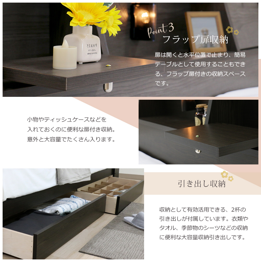 ・物が置けるフラップテーブル付きヘッドボード