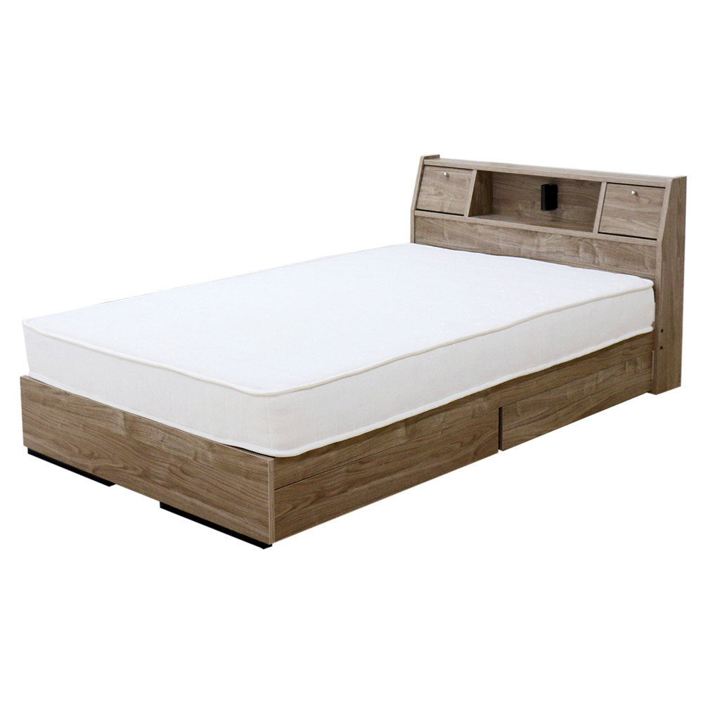 便利なフラップテーブル、照明、コンセント、引き出し収納がついたデザインベッド。