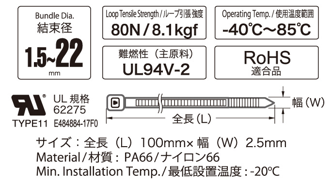 カラータイ 屋内用 100mm 50本入 黄 CT-100W50YE