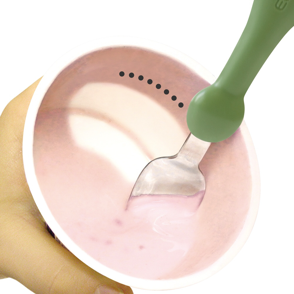 ・先端部が平らな独自の形状が、ヨーグルトカップや食器などの面にフィットし、最後までキレイにすくえます。