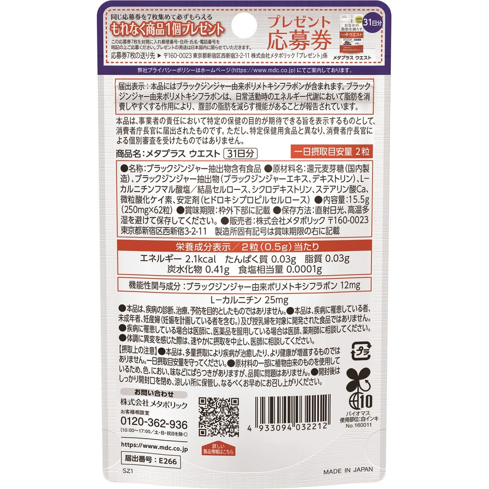 【軽減税商品】メタプラス ウエスト お徳用31日分(62粒)〔機能性表示食品〕