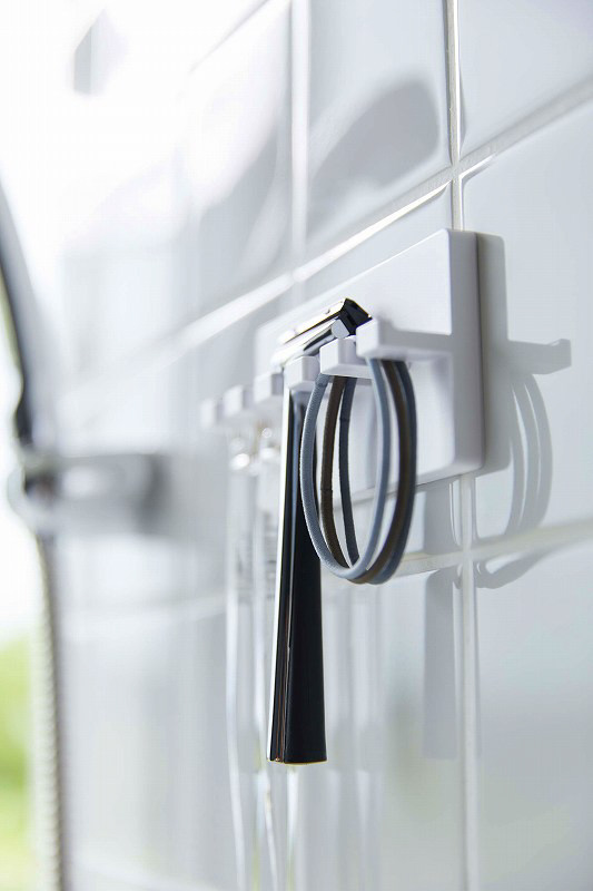 フィルムフックで好きな位置に簡単取り付けの歯ブラシホルダー。浮かせるから歯ブラシがぬめらず衛生的。タイルに取り付け可能。ヘアゴムなどの小物掛けとしても。光沢壁面にフィルムフックで簡単取り付け。