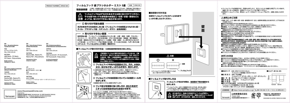 取り付け可能な壁面:光沢のある平らな油染みしない面(フィルムフックの接着面よりも大きい面・タイル・プラスチック面・ステンレス・ガラス・金属塗装面)