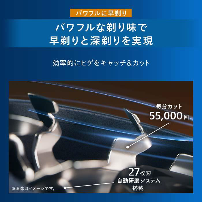 毎分55,000回カットの27枚刃搭載。効率的にヒゲをキャッチ&カットしながら、パワフルな剃り味で早剃りと深剃りを実現。自動研磨システムを搭載し、オイル差し不要なのでシャープな切れ味が続きます。/画像はイメージです。