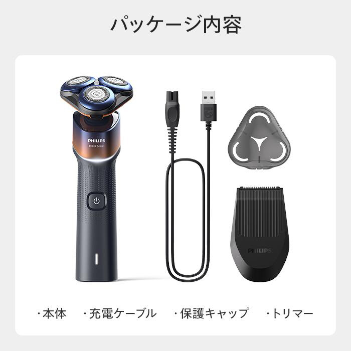 シェーバー本体、取扱説明書、グローバル保証書、充電ケーブル、保護キャップ、トリマ