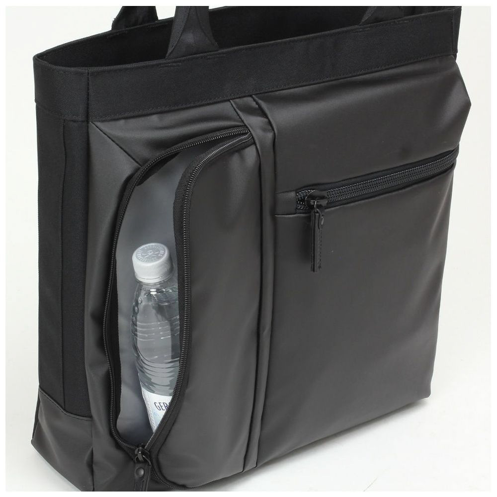 ■逆側の背面ファスナーは貴重品などの収納に便利なポケット、サイドには折りたたみ傘やペットボトルの収納に便利なサイドポケットを備えております。
