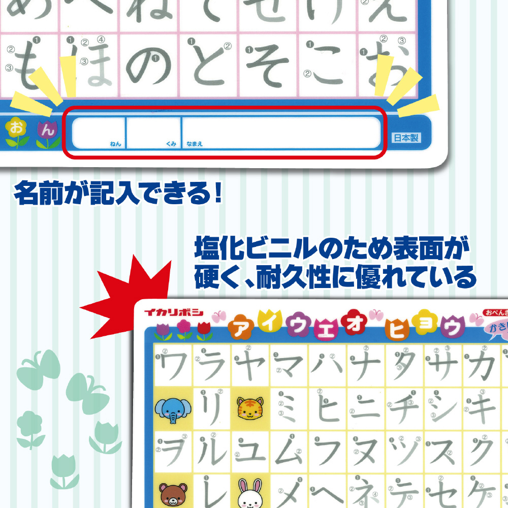 ひらがな・カタカナ/かけざん/ローマ字・アルファベット 各3種繰り返し使えるひらがな・カタカナの下敷き!