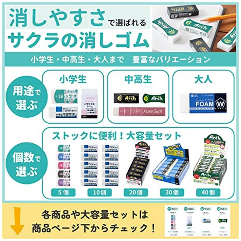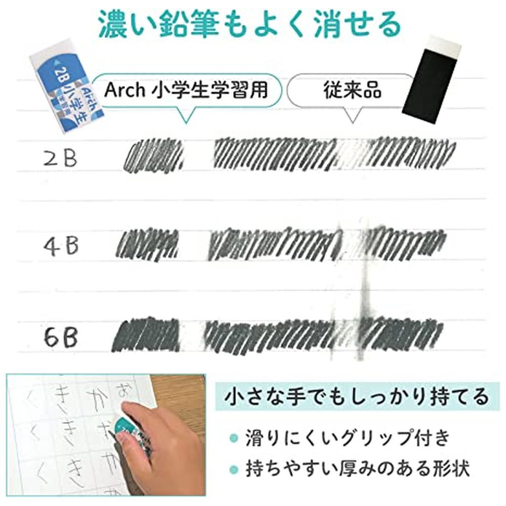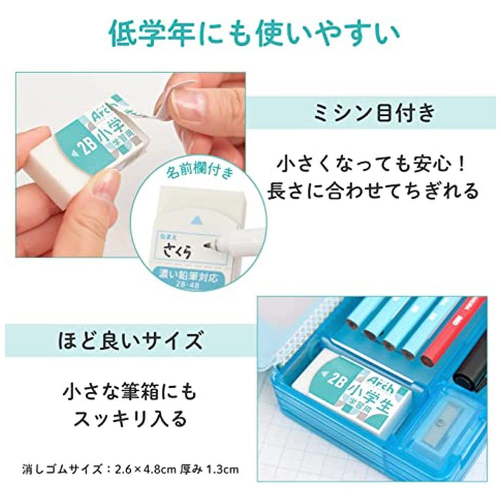 厚みのある形状なので、小学生でもしっかり持てます。消しゴムが劇的に折れにくいアーチ形状のケース入りです。コンパクトな筆箱にも収納可能なサイズです。