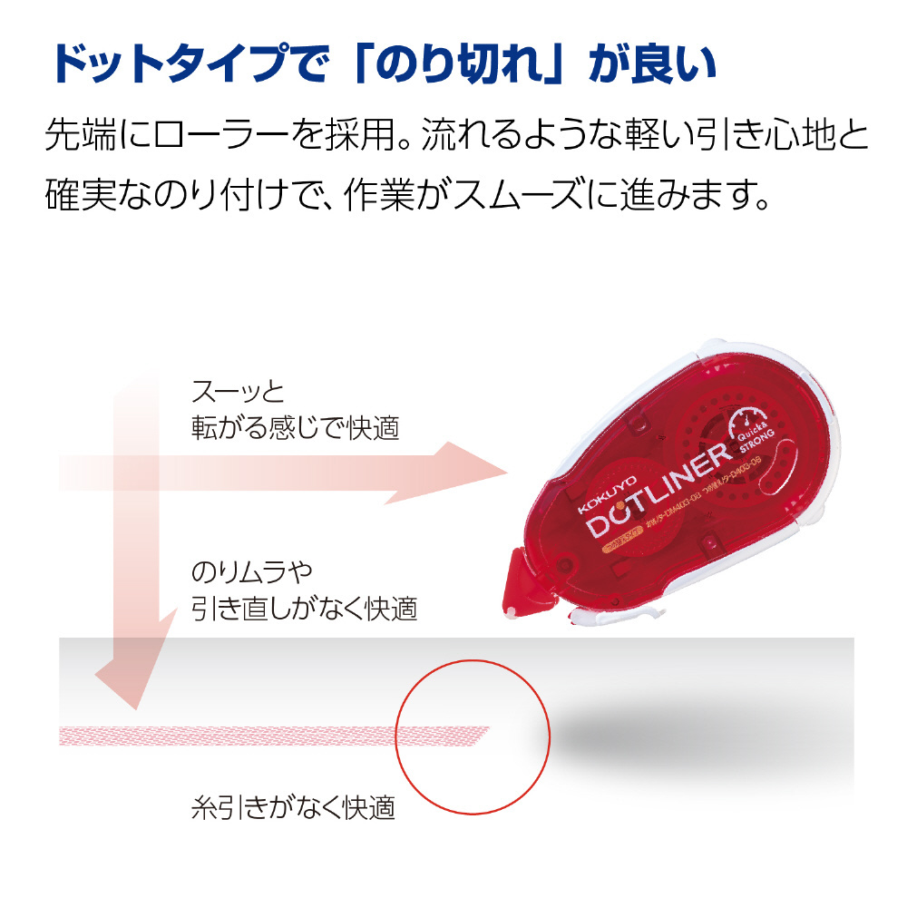 ・粒状になったのりを使用したドットタイプのテープのり。糸ひきがなく、ピタッとキレイに塗れます。