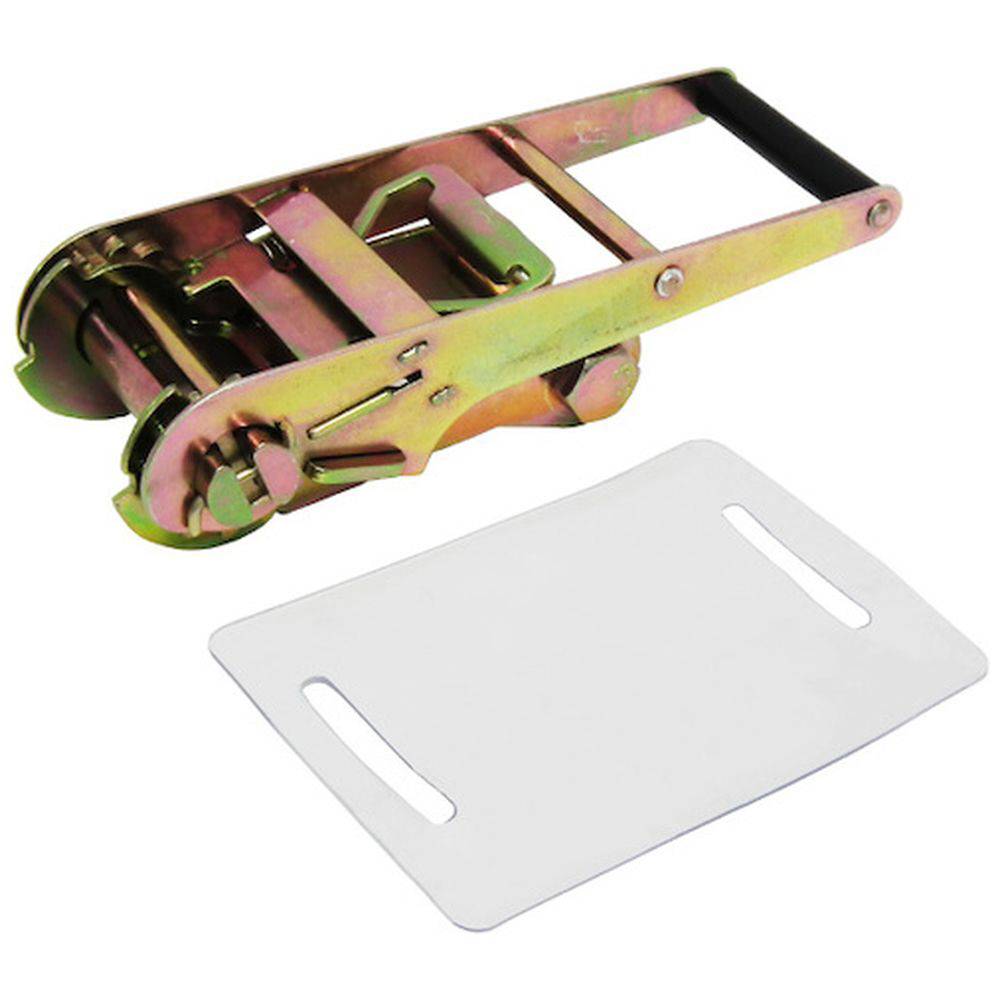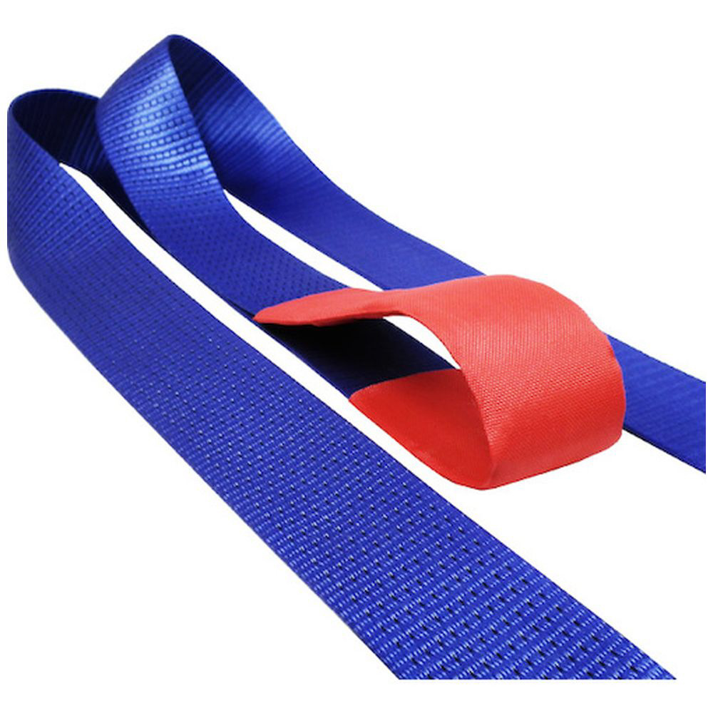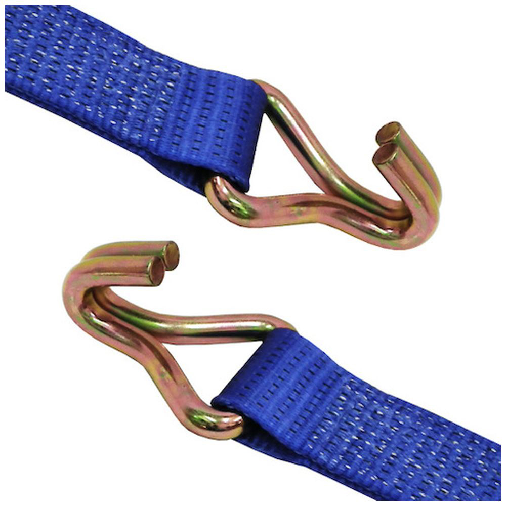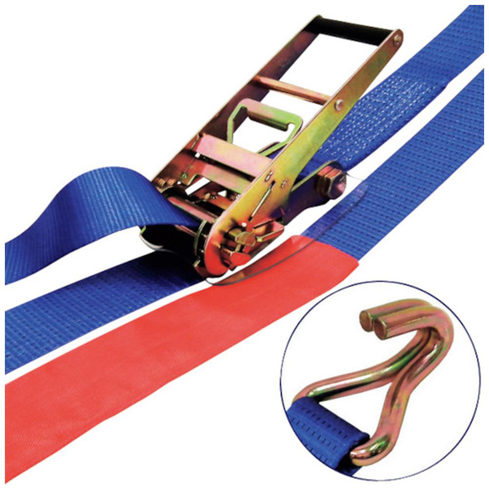 ラチェットバックル式カギフックのラッシングベルト、握り易いバックルと柔軟強度な繊維ベルトで荷に優しく簡単安全に荷締め作業ができます。