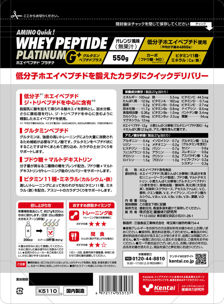 【軽減税商品】ホエイペプチドプラチナ グルタミンペプチド プラス オレンジ風味 550g K5110