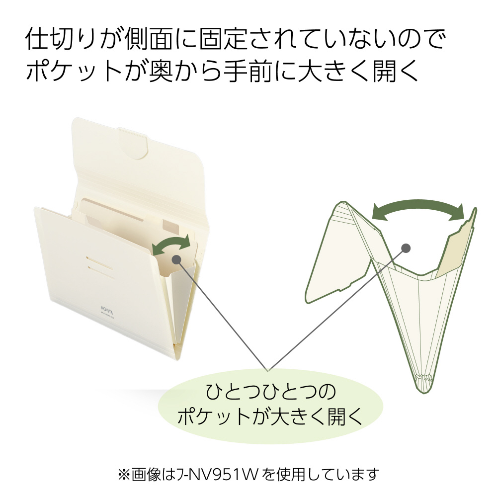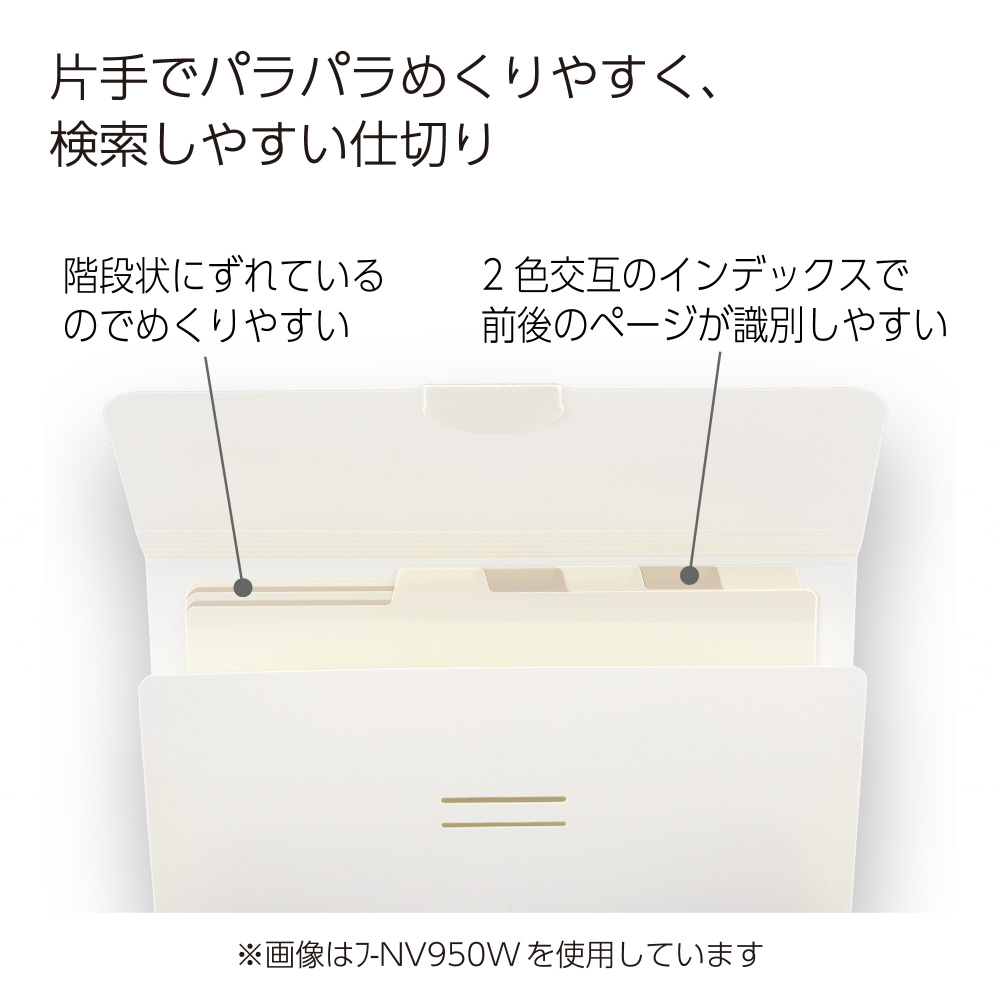 ●仕切りの上部が階段形状になっており、パラパラとめくりやすく目的のポケットを検索しやすいです。また、前後のページが識別しやすいように仕切りは2色交互に配色をしています。