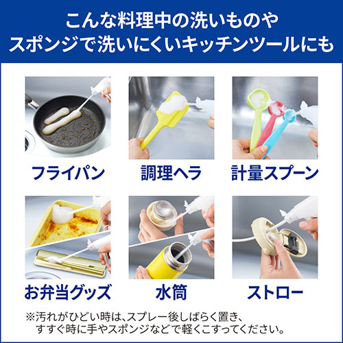 奥・ミゾ・スキマまで泡が届いてこすらず洗浄!洗いにくい様々な食器類にオススメです。スピード分解酵素新配合で落としにくい脂汚れまでスッキリ落とすから料理中の洗い物までパパパッと片づく。1本で除菌※・ウイルス除去※*・消臭・くすみ落としの4つの効果。(※すべての菌・ウイルスを除去するわけではありません。*エンベロープタイプのウイルス1種で効果を検証。)無香性