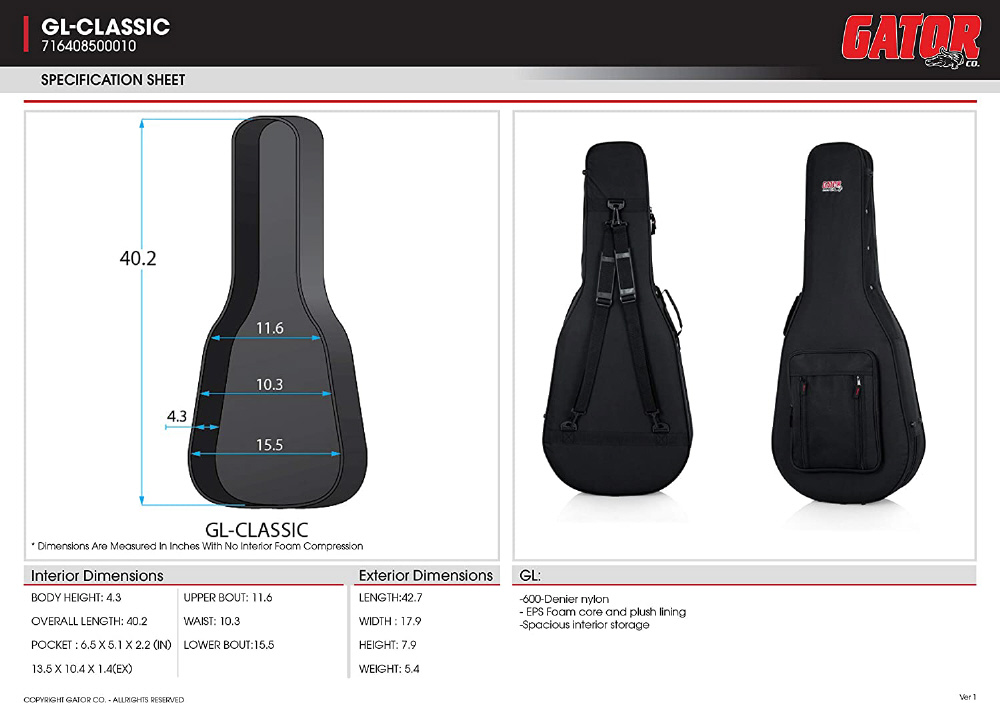 ・外装は600デニールのナイロン、内装は保護に優れたEPSフォームを使用したクラシックギター用セミハードケース