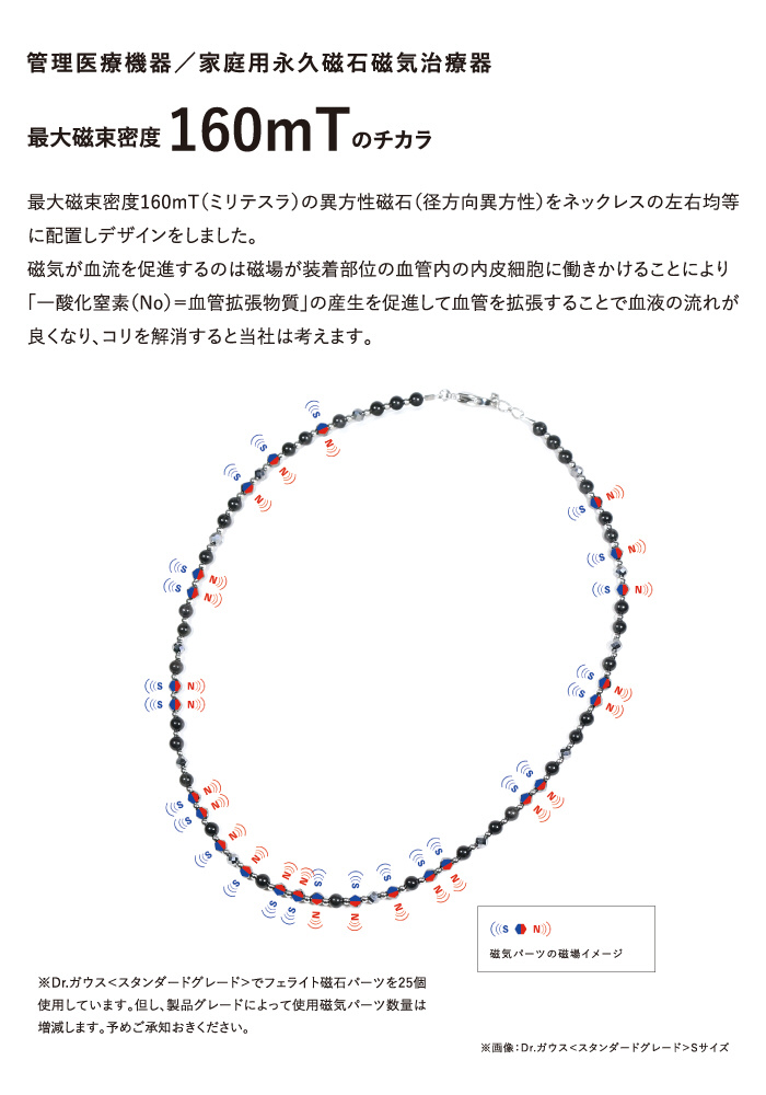 家庭用永久磁石磁気治療器として開発され、管理医療機器の認証を受けたネックレスです。