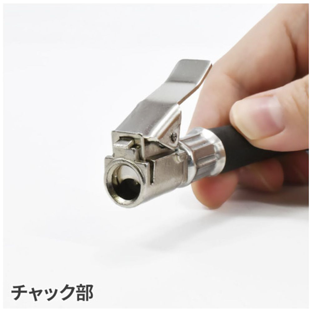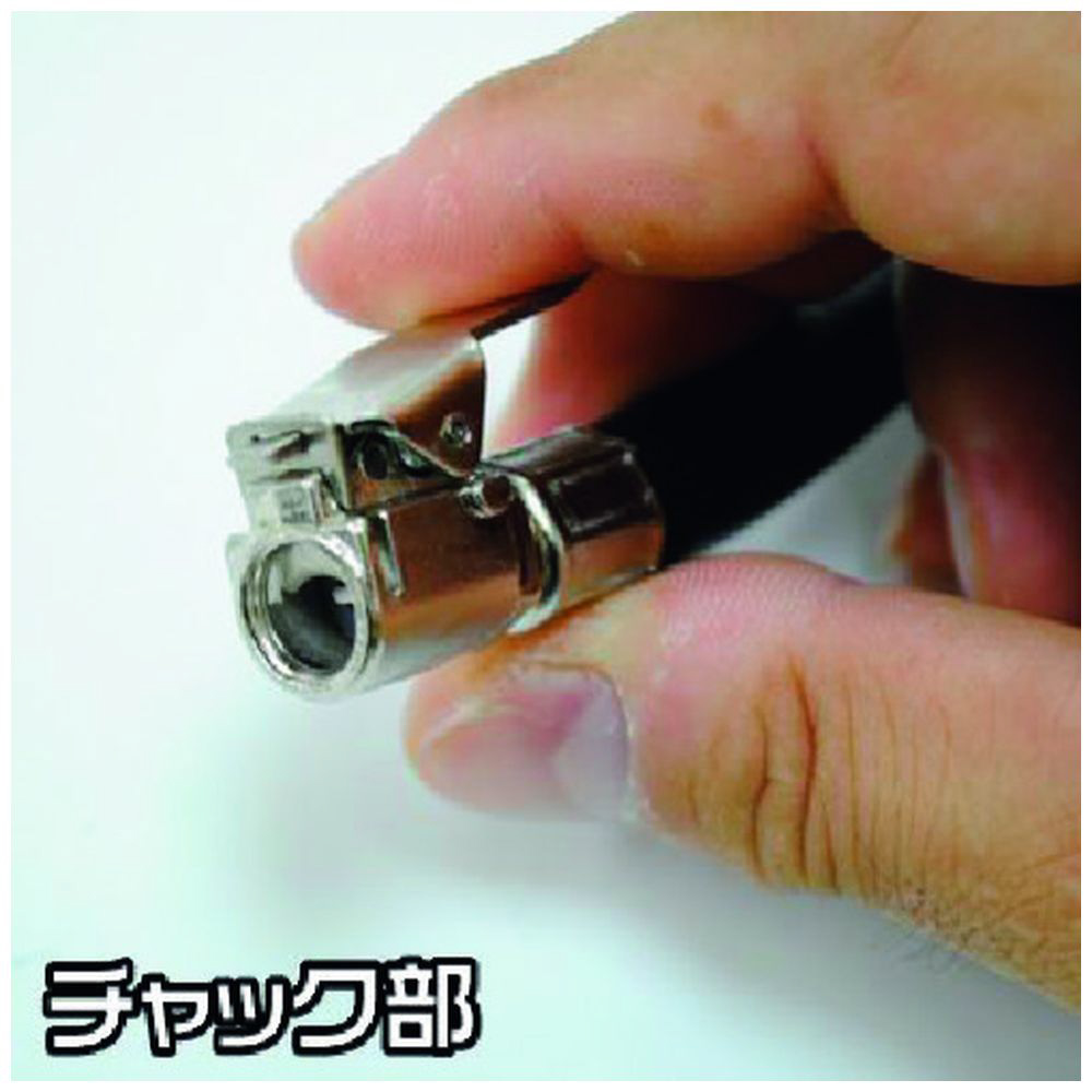 ■タイヤのバルブには、クリップチャックで接続するので、充填中にチャックを押しあてておく必要がありません。