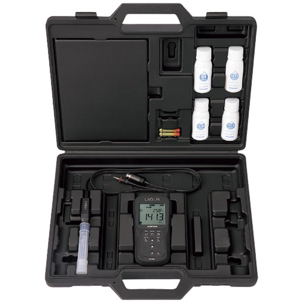 ・本体、電気伝導率電極: 9383-10D(測定範囲: 1μS/cm〜100mS/cm)、電気伝導率標準液(84μS/cm、1413μS/cm、12.88mS/cm、111.8mS/cm)各60mL、取扱説明書/簡易マニュアル、電池、USB出力ケーブル(PC接続用)、キャリングケース