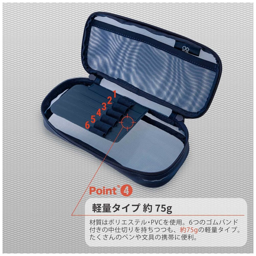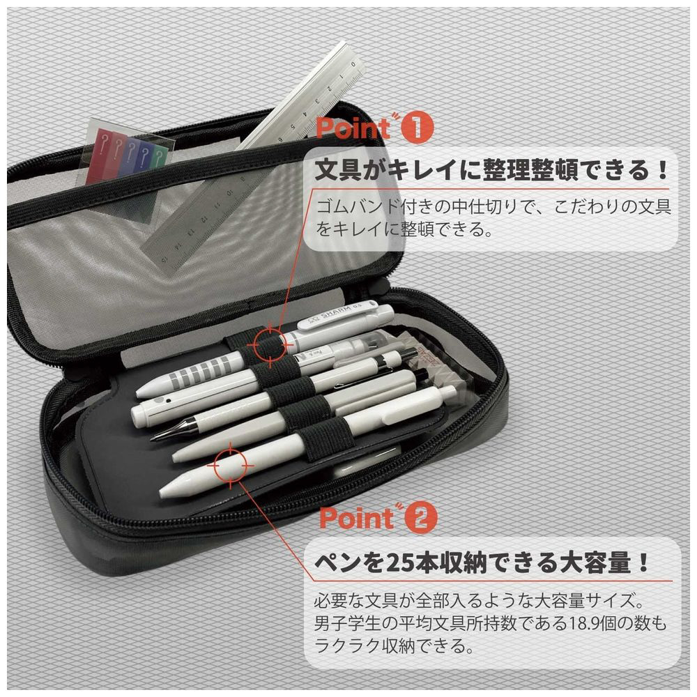 必要な文具が全部入るような大容量サイズ。男子学生の平均所持数である18,19個の数もラクラク収納できる。