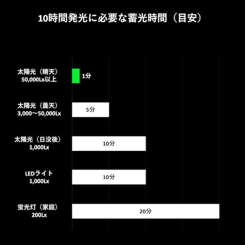 ・10時間発光に必要な蓄光時間目安: 太陽光(晴天)約1分