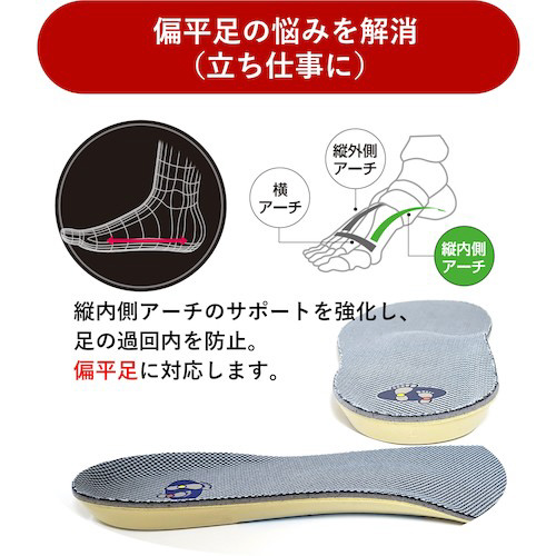 つらい偏平足に、内側のアーチサポートを強化し、土踏まずの低下を防止します。