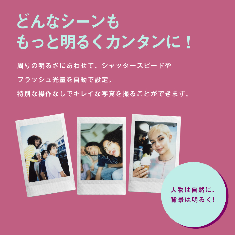 周りの明るさにあわせて、シャッタースピードやフラッシュ光量を自動で設定。 特別な操作なしでキレイな写真を撮ることができます。