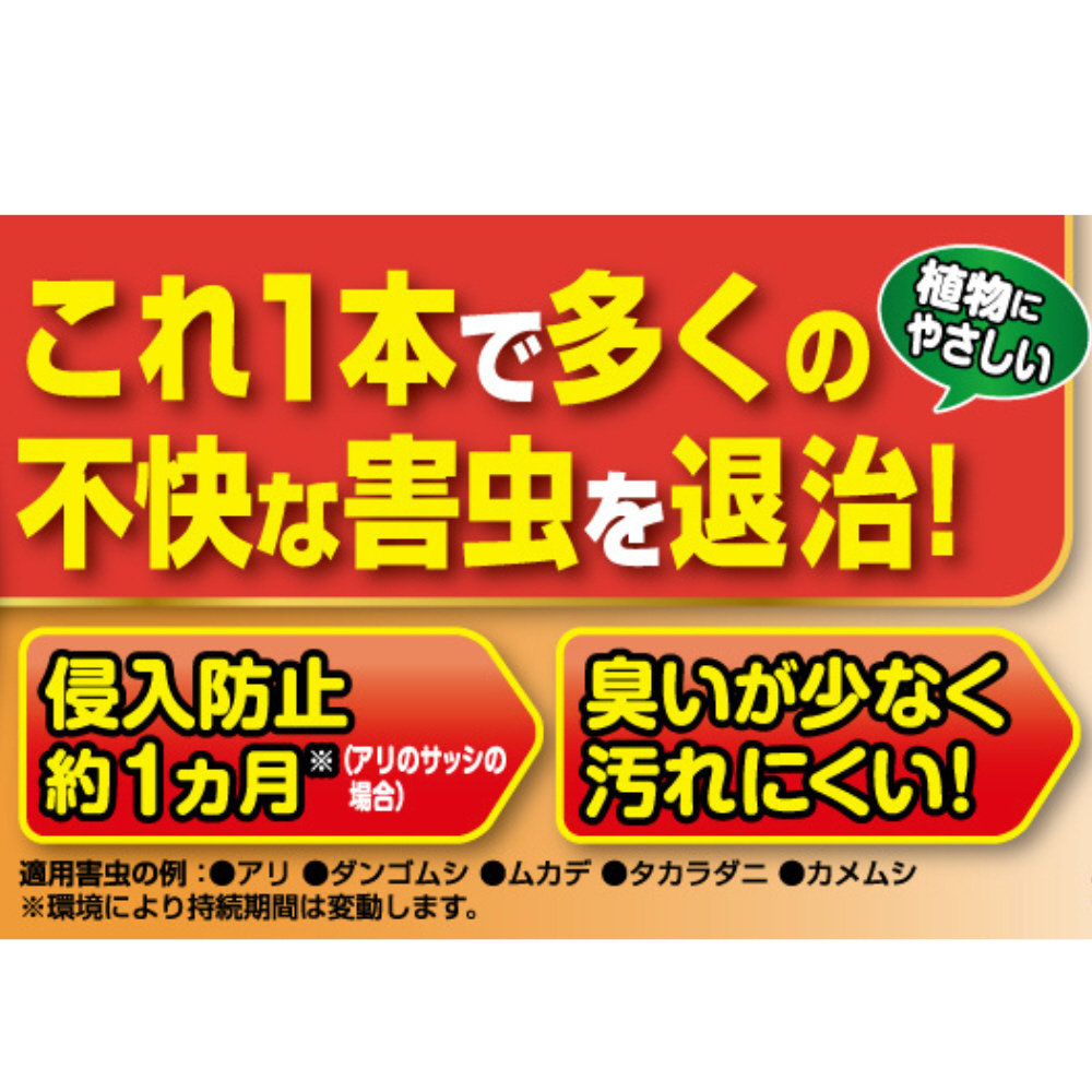 仕様1 適用害虫:アリ、羽アリ、ヒアリ、アカカミアリ、アルゼンチンアリ、ハヤトゲフシアリ、アシナガキアリ、ツヤオオズアリ、アシジロヒラフシアリ、シロアリ、ワラジムシ、ゲジ、ヤスデ、クモ、セアカゴケグモ、ゴミムシ、ヒラタキクイムシ、タカラダニ、ガ、コバエ、チョウバエ、ユスリカ、アブ、ブユ、ダンゴムシ、カメムシ、ケムシ、コガネムシ