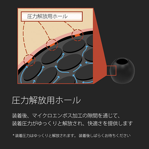 特徴的なエンボス加工が施され、表面は非常にツルツルとしていて柔らかく肌触りは抜群なイヤーチップ。