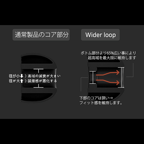 コア部分は中央は通常のイヤーチップのコアと変わらない様に見えますが上部に向かうと大きな径を有し、高域の減衰を抑えます。