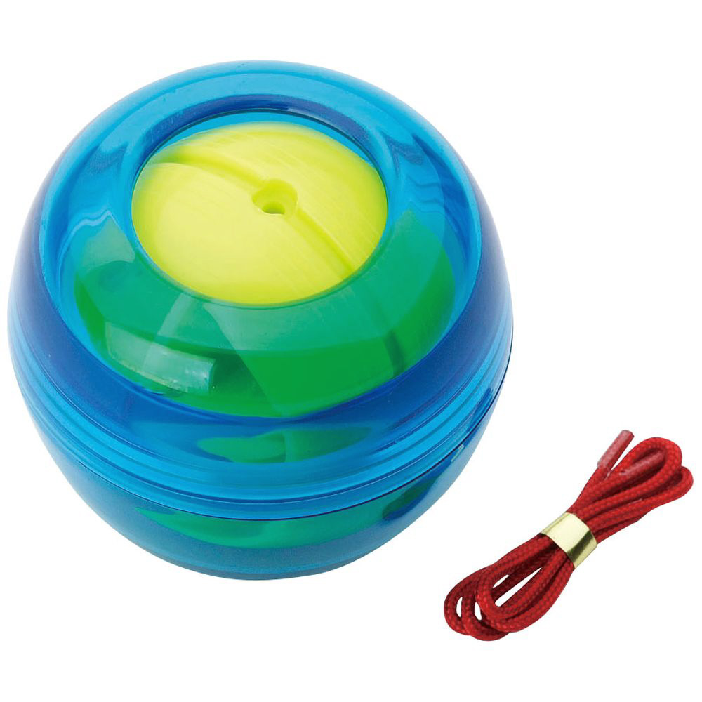 いつでもどこでも、手首の鍛錬!ヒモの矢を回転球の穴に差し込み、回転の溝にそって巻いたヒモを引きますと回転球が発生。