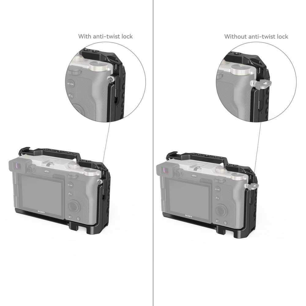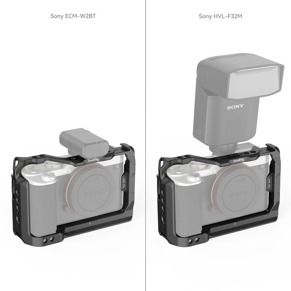 SmallRig Sony Alpha 7C 用カメラケージ3081Bは、プロフェッショナルなビデオ撮影において、モニター、マイク、LEDライトなどのアクセサリーを取り付けるためのマウントポイントを提供するために設計されています。ケージは底面の1/4-20のネジでカメラに固定されます。さらにねじれを防止するために、スライダーを押し上げて右側のロックをかけ、付属の小ネジをカメラのストラップホールに固定することもできます。ケージには複数の1/4-20ネジ穴とARRI 3/8-16位置決め穴があり、Vlog撮影用にトップハンドル2165、コールドシューエクステンション2879、三脚BUT2664を取り付けることが可能です。上部の内蔵コールドシューはマイクやLEDライトに、下部の内蔵アルカタイプクイックリリースプレートはDJI RS 2 / RSC 2 / RS 3 / RS 3 Proジンバルに対応し、手持ち撮影とスタビライザー撮影を素早く切り替えられます。 また、ケージの底面にはマグネット式のドライバーが内蔵されており、簡単に使用することができます。ケージは、バッテリードア、スクリーン、カードスロット、ボタンなどを塞ぐことなく、カメラにシームレスにフィットします。カメラ本来の機能を完全に維持します。