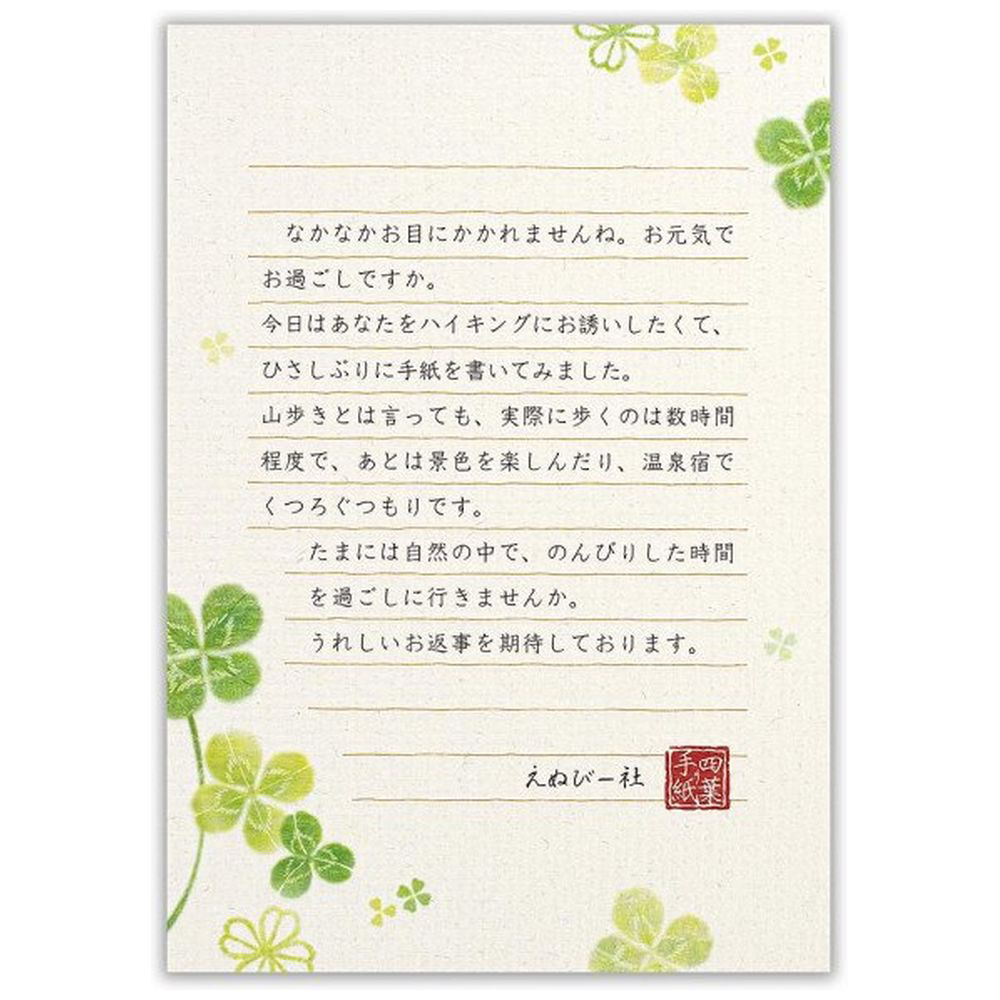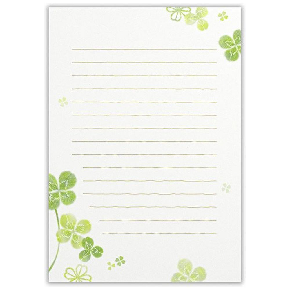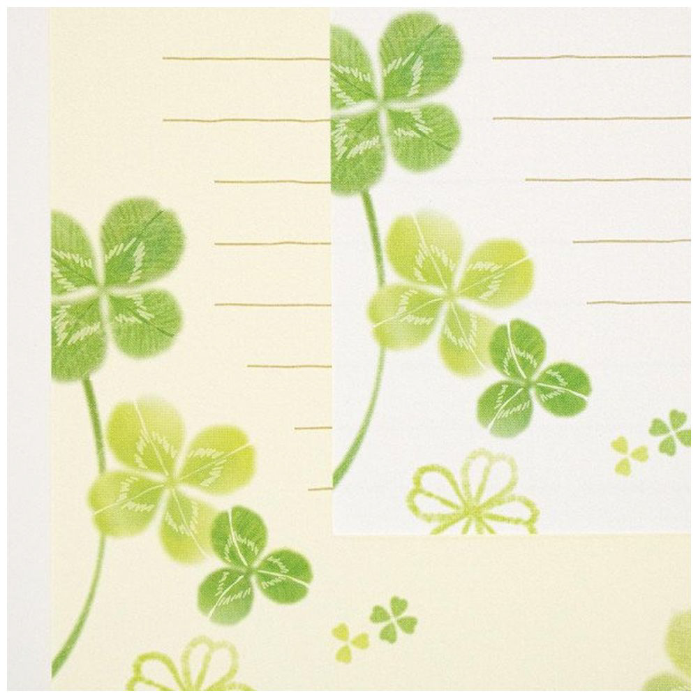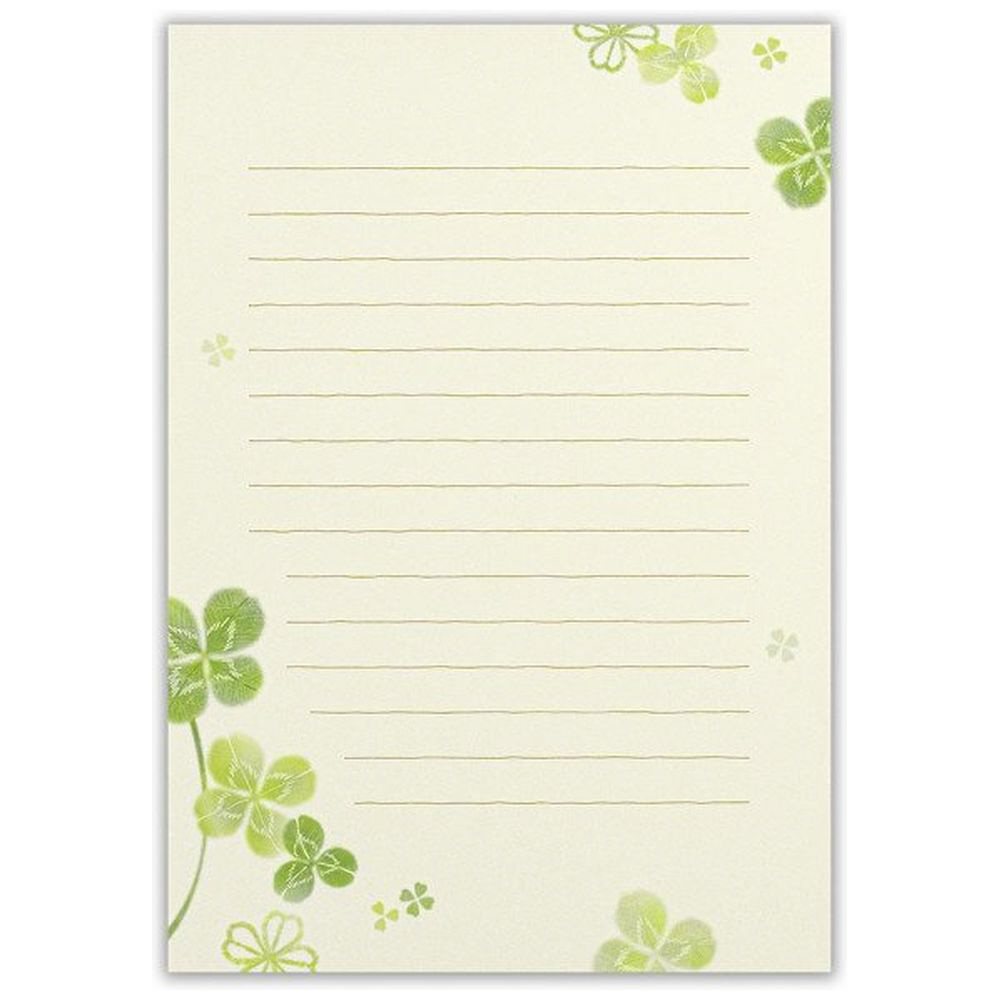 若々しい四葉に飾られた便箋です。白と薄い緑色の2色アソートです。優しいクローバーが描かれています。書いた時のイメージがしやすいよう、表紙に文例を載せました。