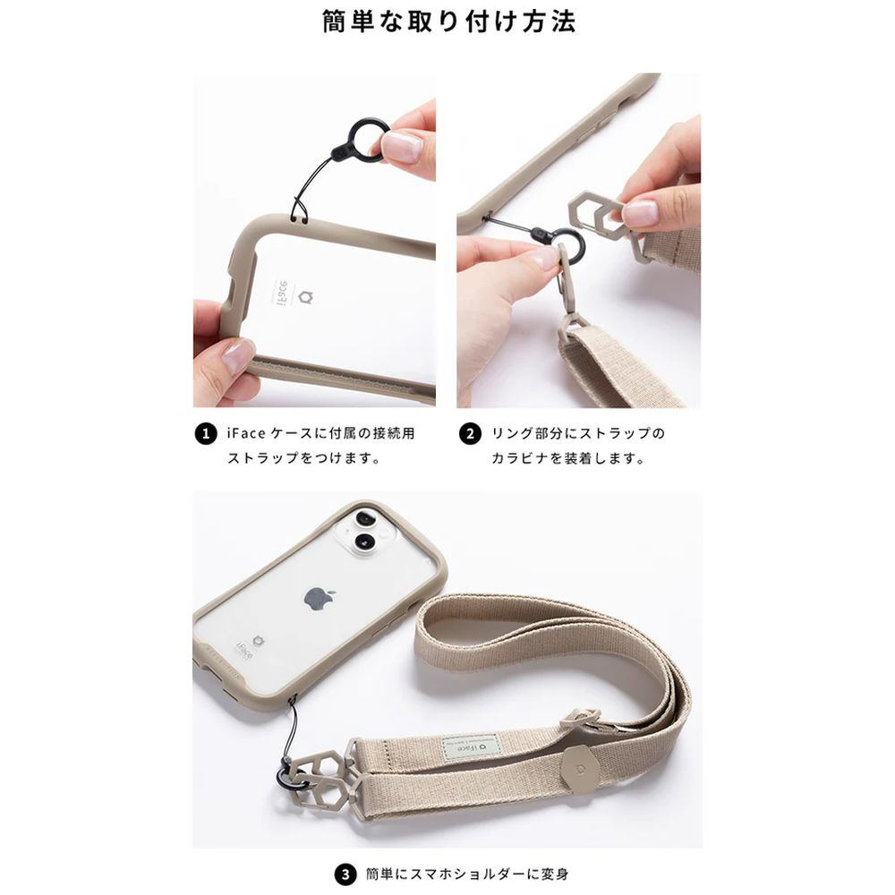 付属の接続用ストラップで、お気に入りのiFaceケースが肩掛けタイプとして使えます。