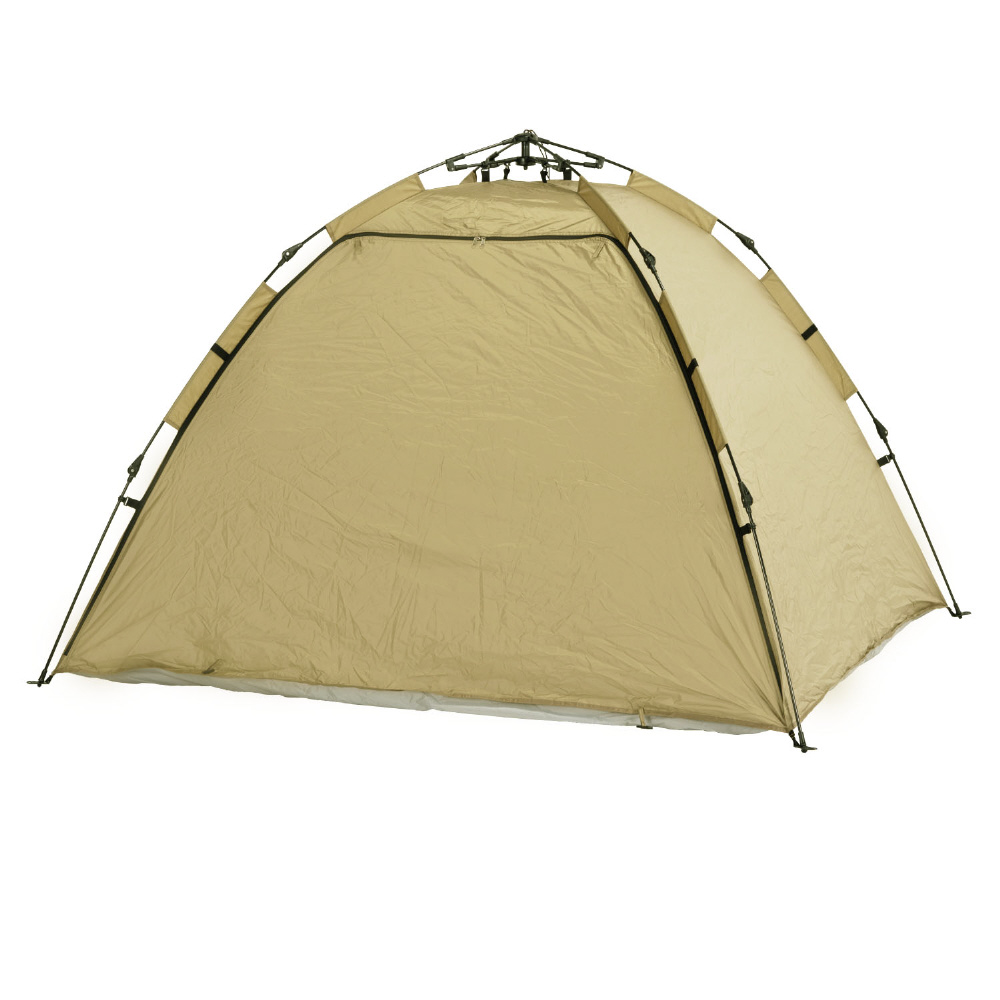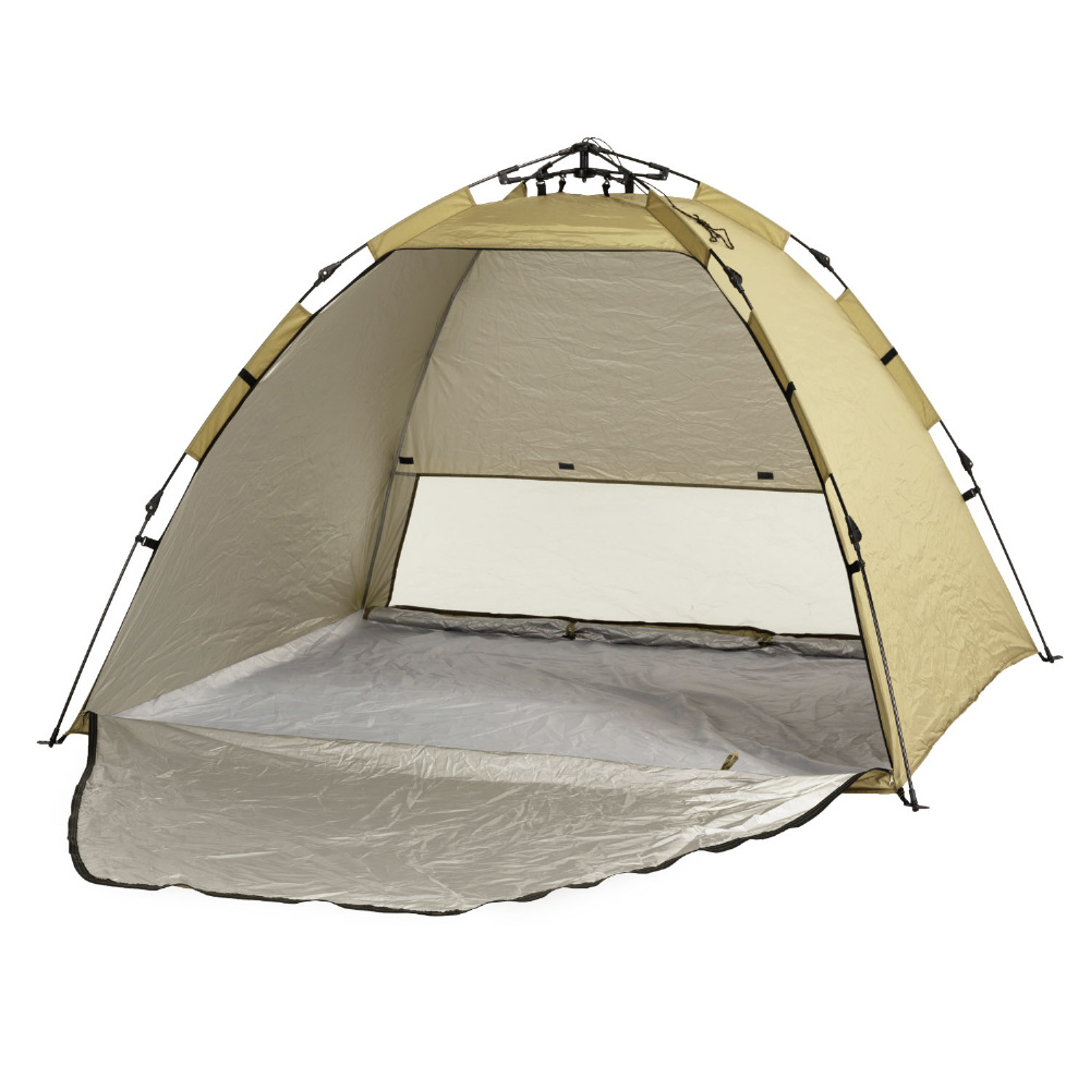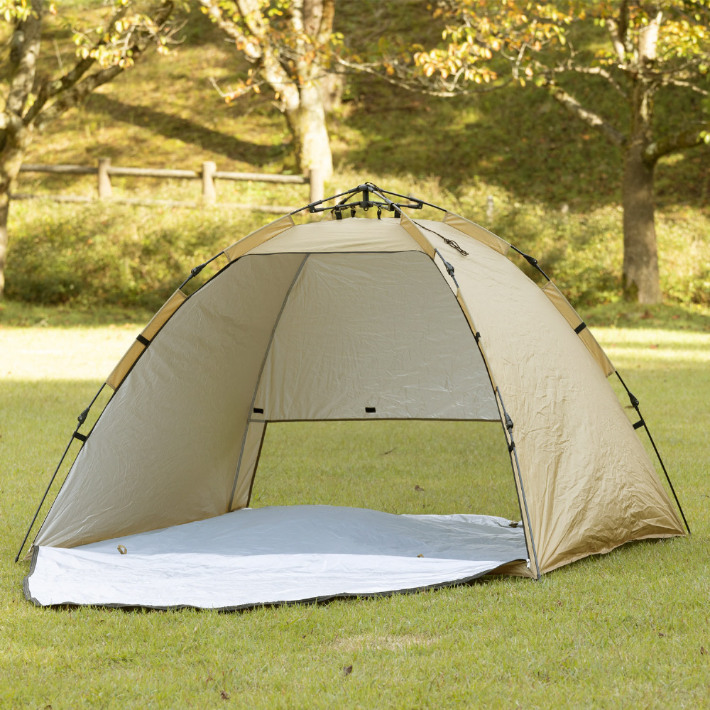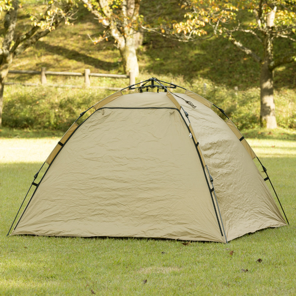 紐を引くだけで簡単設営。 背面は巻き上げでメッシュ窓ができるので通気がよく、前面はフルクローズ可能。