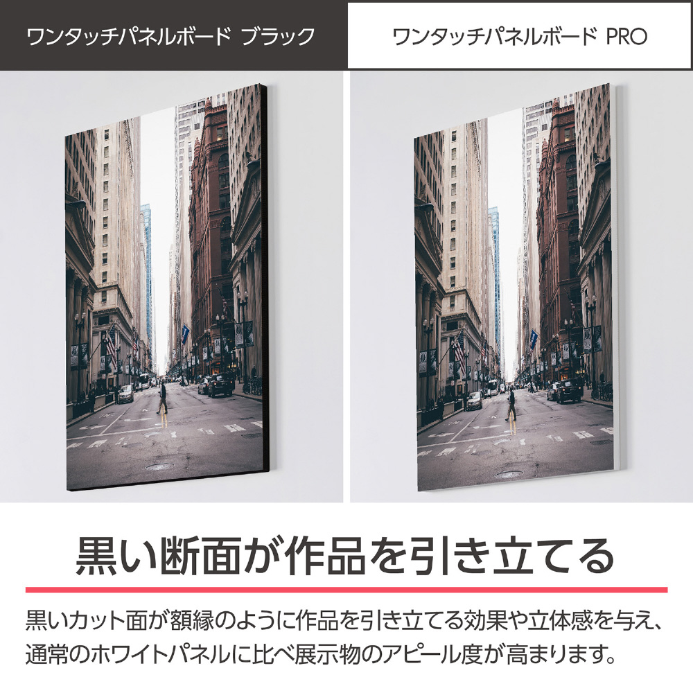 黒いカット面が額縁のように作品を引き立てる効果や立体感を与え、通常のホワイトパネルに比べ展示物のアピール度が高まります。