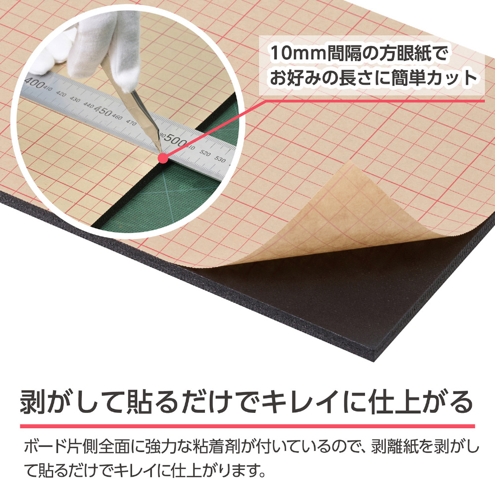 ボード片側全面に強力な粘着剤が付いているので、剥離紙を剥がして貼るだけでキレイに仕上がります。剥離紙は10mm間隔の方眼入りなのでカッターなどでお好みの長さや形にカットすることができます。
