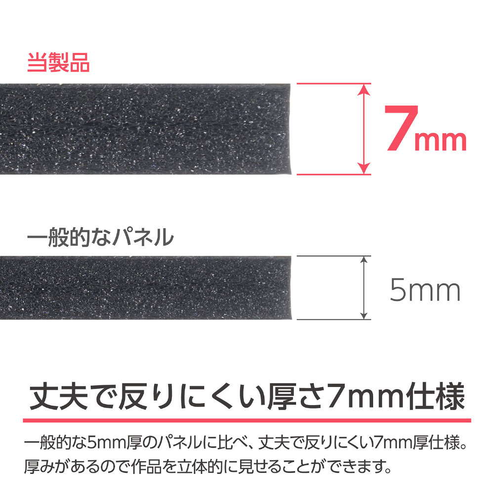一般的な5mm厚のパネルに比べ、丈夫で反りにくい7mm厚仕様です。厚みがあるので作品を立体的に見せることができます。